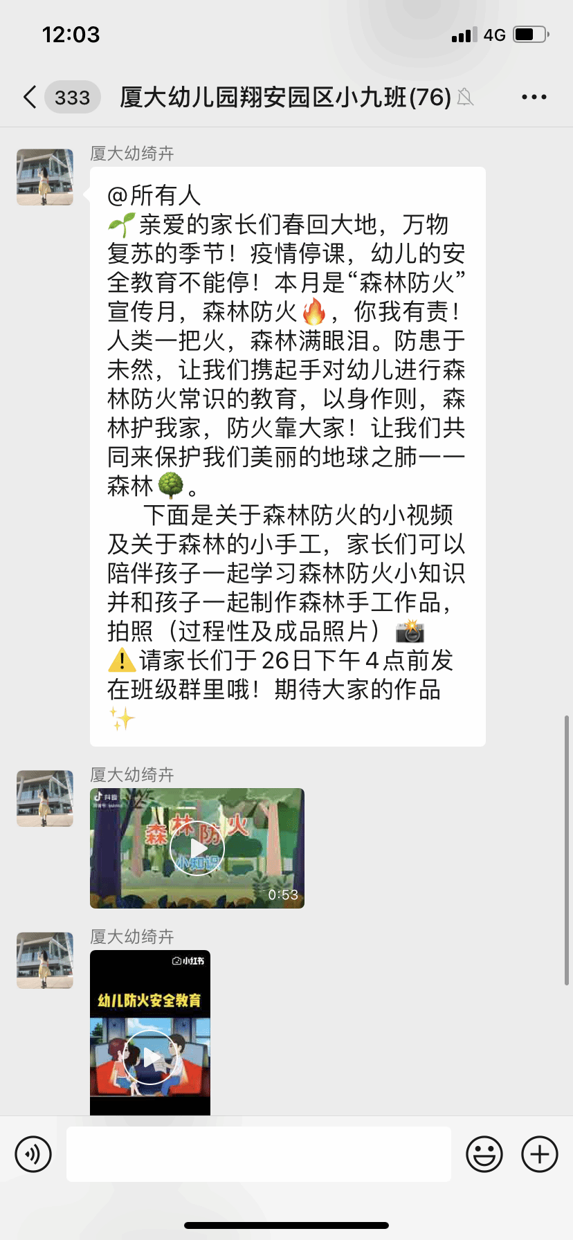 绿树浓荫,野花遍地,如此生机,如此安宁的森林是一道美丽的风景。可破坏这份宁静也许是一点小火星,一个不起眼的烟头。为了让福娃们了解森林防火的重要性,提高防火意识,老师们在居家期间通过云端开展了“一点星火,可毁万顷”森林防火的宣传活动。