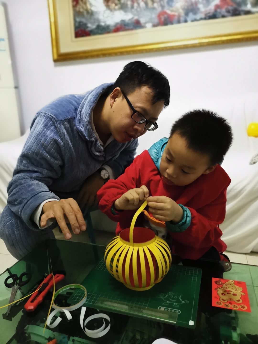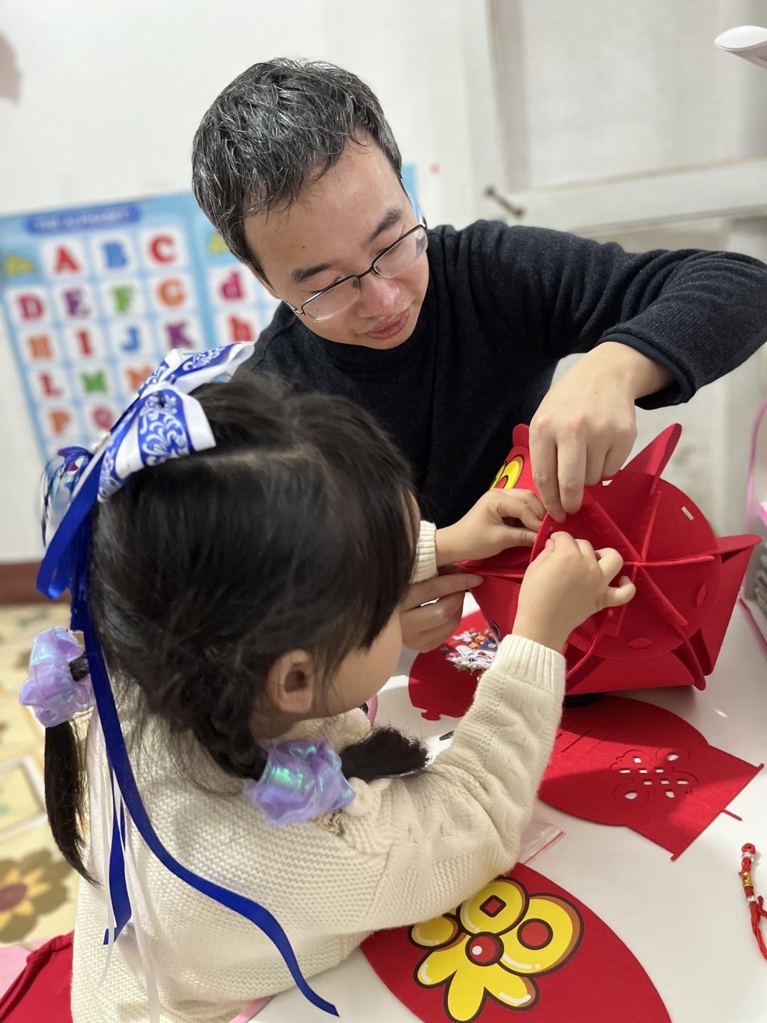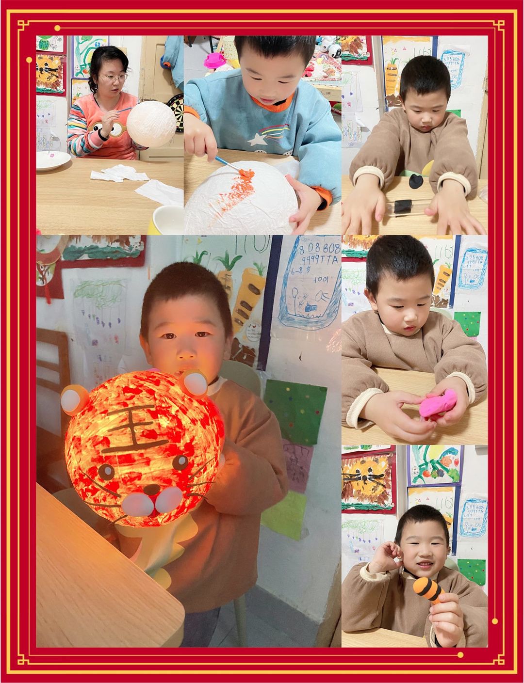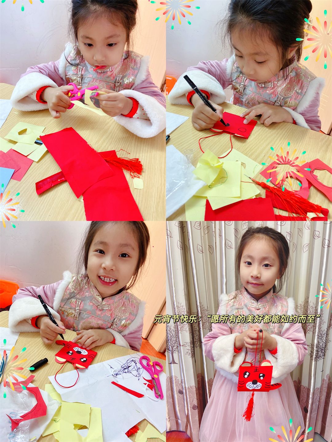 过元宵,编花灯,福娃们与爸爸妈妈们的合作,各显神通;瞧,各式各样的创意花灯在福娃们的手中孕育而生,一盏盏独一无二的花灯便新鲜“出炉”啦!