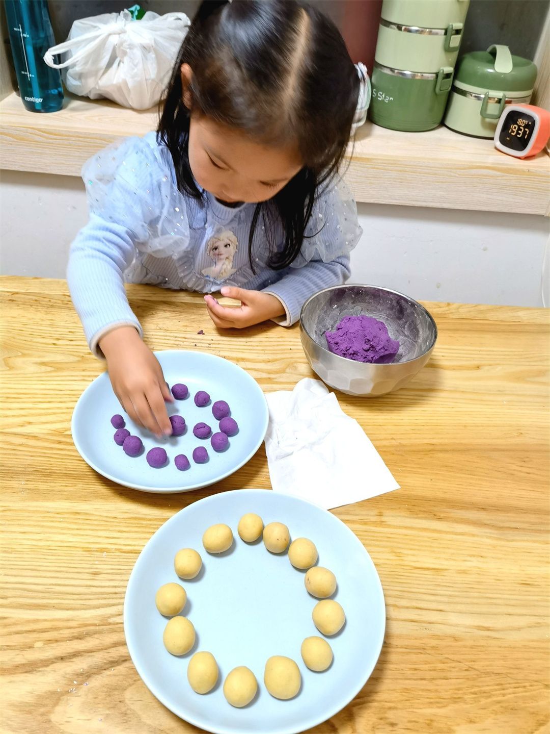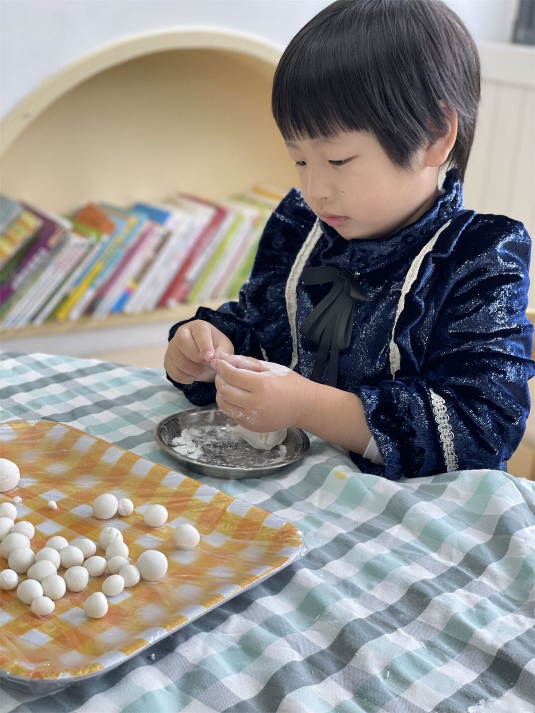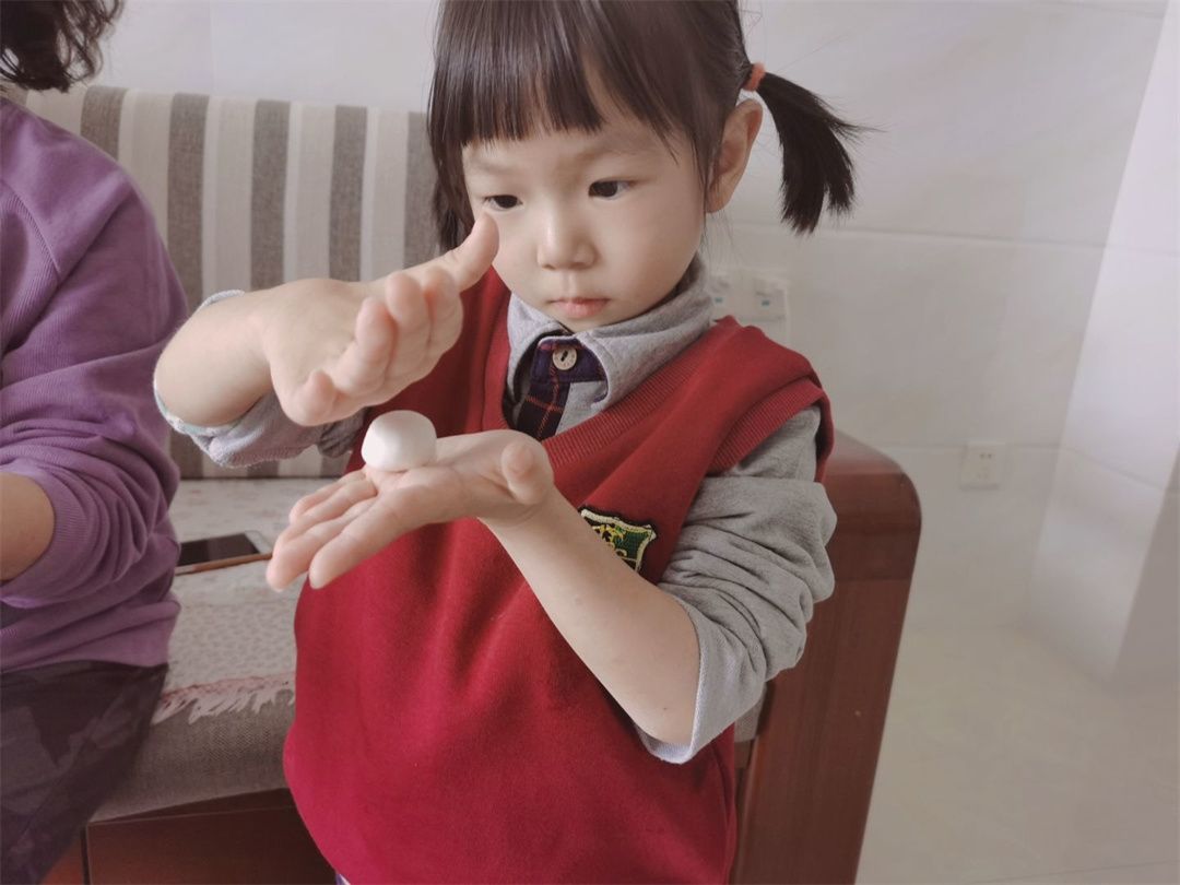 福娃们迫不及待地开始搓汤圆啦!白白的糯米粉,加水揉成团,掰一小块,压成片儿,舀点馅料,包起来搓一搓,圆圆的汤圆就包好啦!