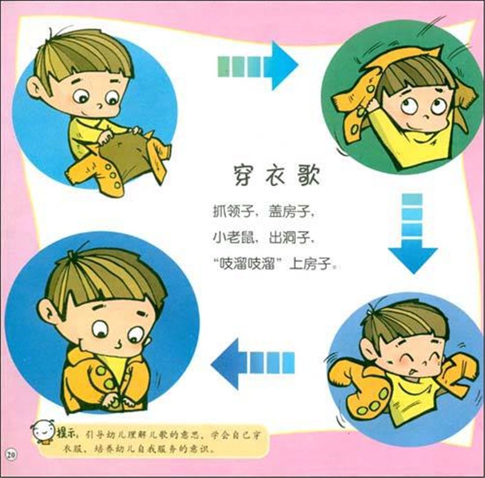 切忌为了赶时间或者怕麻烦帮孩子完成这件事。如若孩子不愿意自己穿衣服,可以准备几首穿、脱衣服的小儿歌,用说唱和游戏的方式吸引孩子,让他们觉得穿衣服是一件很快乐、有趣的事,这样穿衣服就变得简单多了。