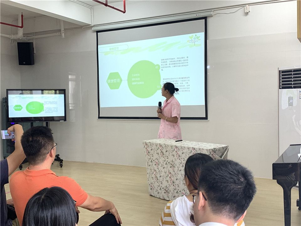 保健医生王老师就卫生保健方面的流程及主要工作内容向家长们进行一个简要汇报,让家长们更加放心地将宝贝交给幼儿园,亦便于今后保健工作开展。