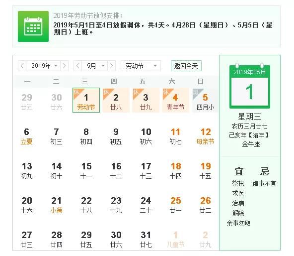 根据《国务院办公厅关于2019年节假日安排的通知》,现将2019年五一劳动节具体放假安排如下: