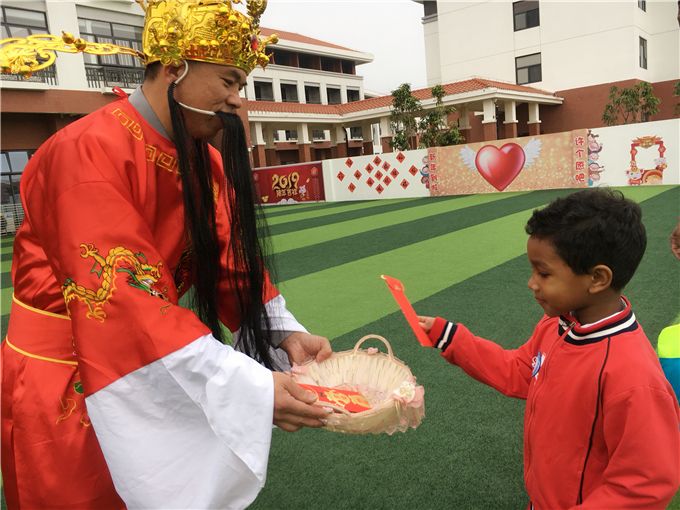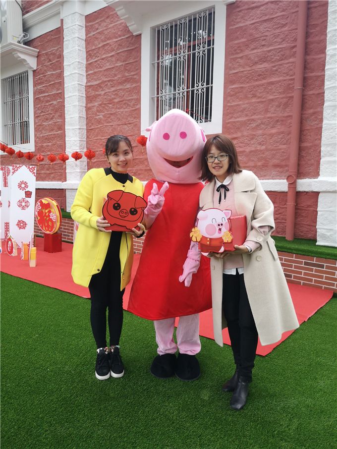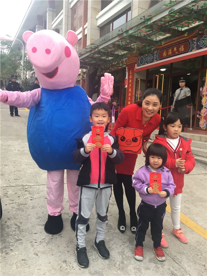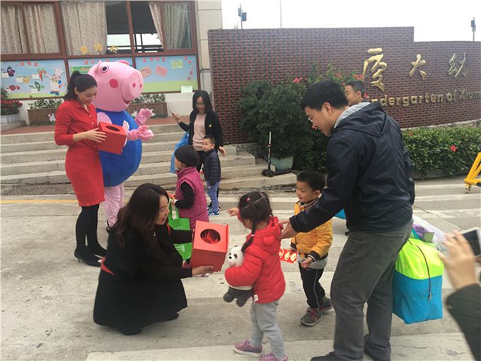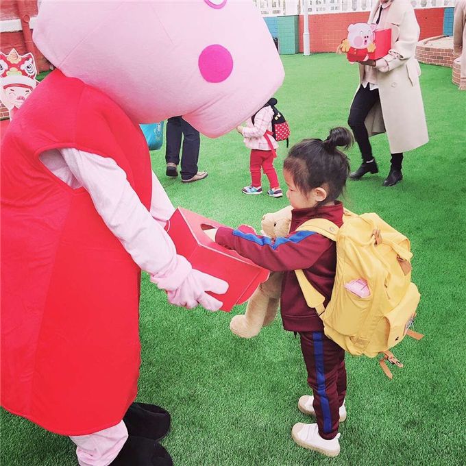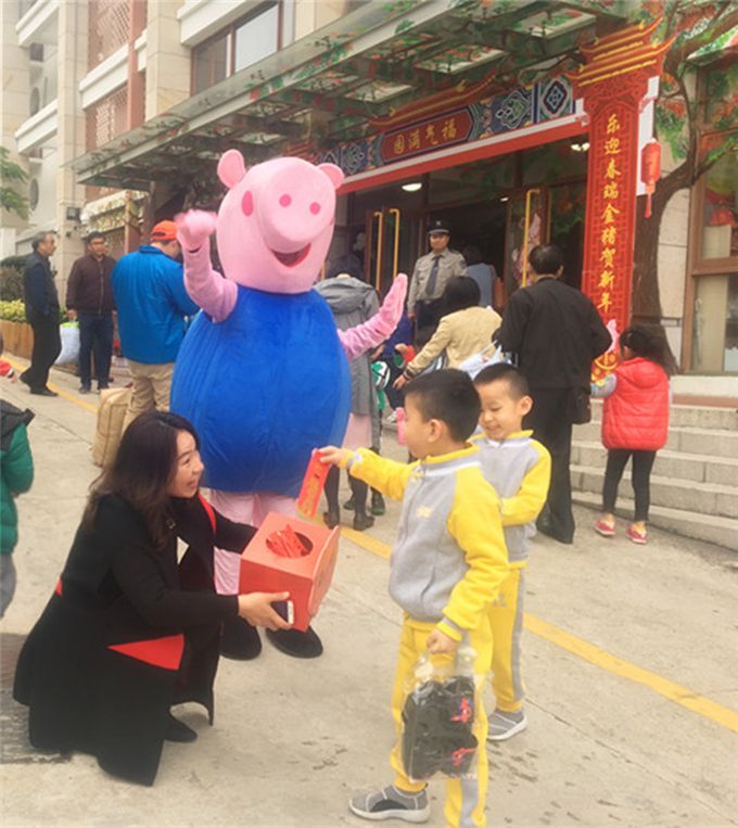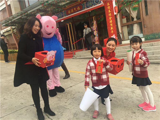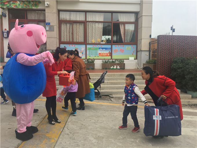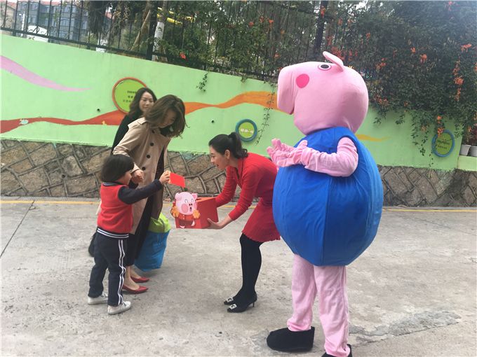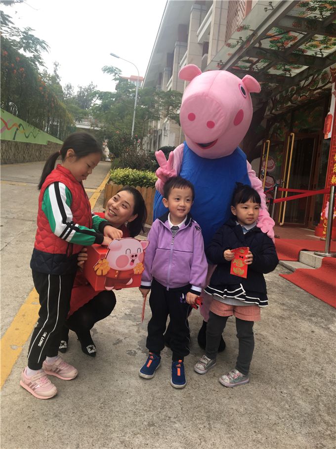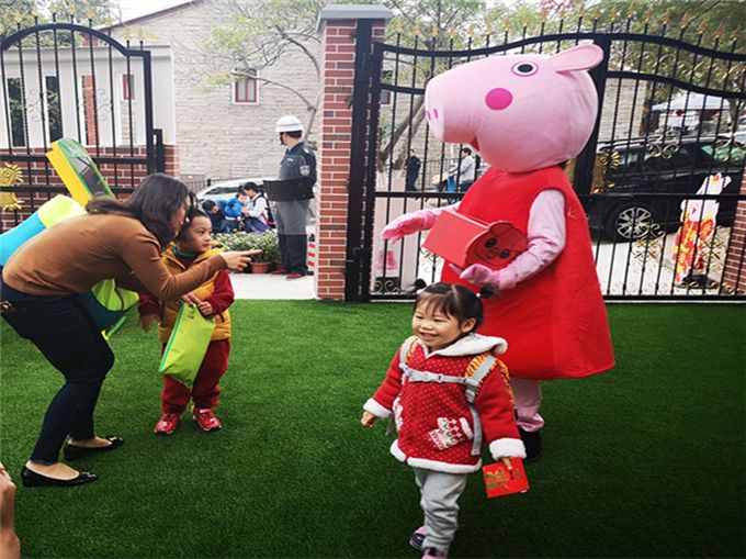 快乐福娃们开学啦!清晨,当小福娃们带着小被褥跟着爸爸妈妈来到阔别一个寒假的幼儿园时,迎接他们的是笑眯眯的老师、憨态可掬的小猪佩奇和充满喜气的阿福叔叔!