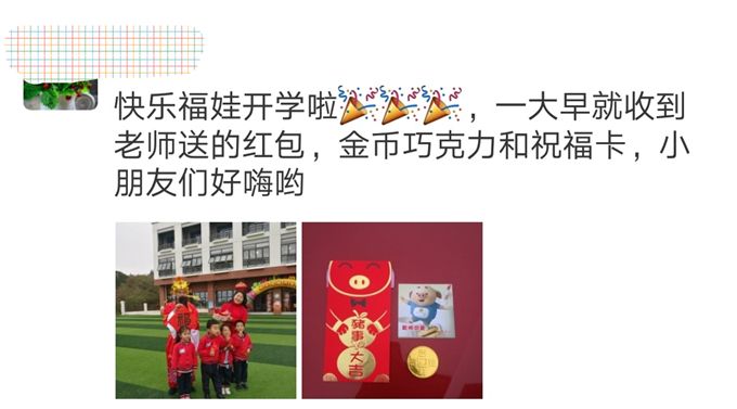 可爱的小猪贺卡和金币巧克力,带着老师们满满的祝福和暖暖的爱,传递在福娃们和家长们的心间。希望福娃们在新的学期里身体壮壮、本领棒棒!