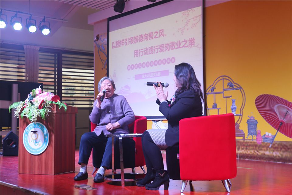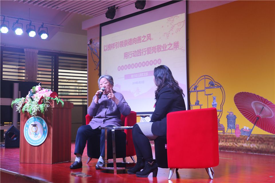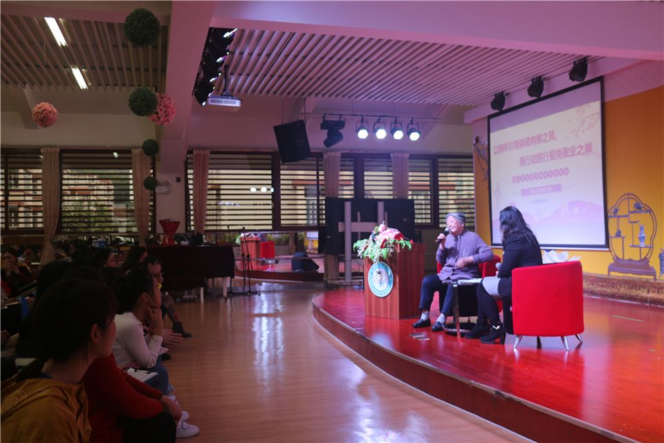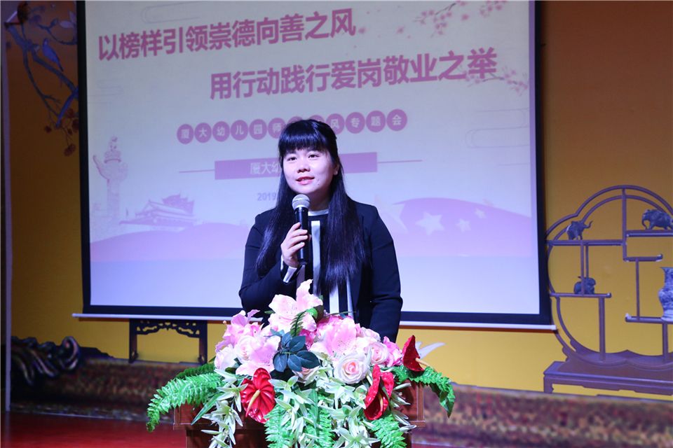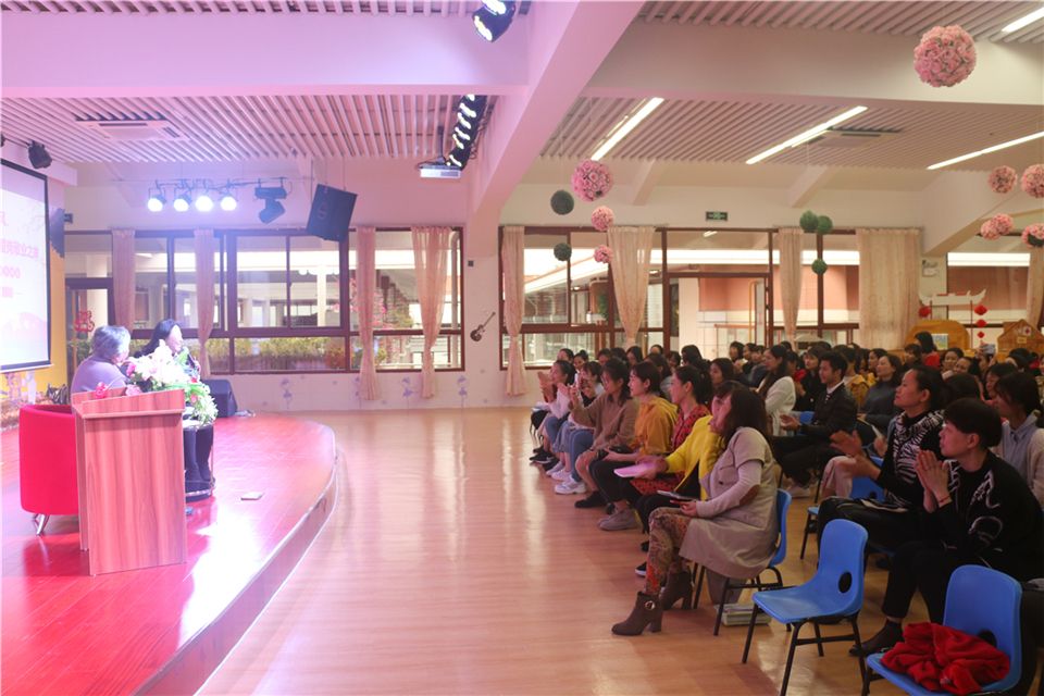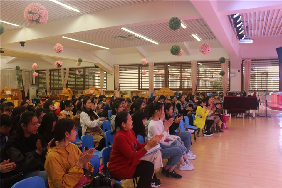 关老师分享了自己从教30多年的点滴,从一人带着156个孩子到后山散游,到顶着12级台风,怀着四个月身孕仍只身前往幼儿园陪伴25个留守幼儿的点滴事迹……老师们听得热泪盈眶,无不为此动容,并报以热烈的掌声。