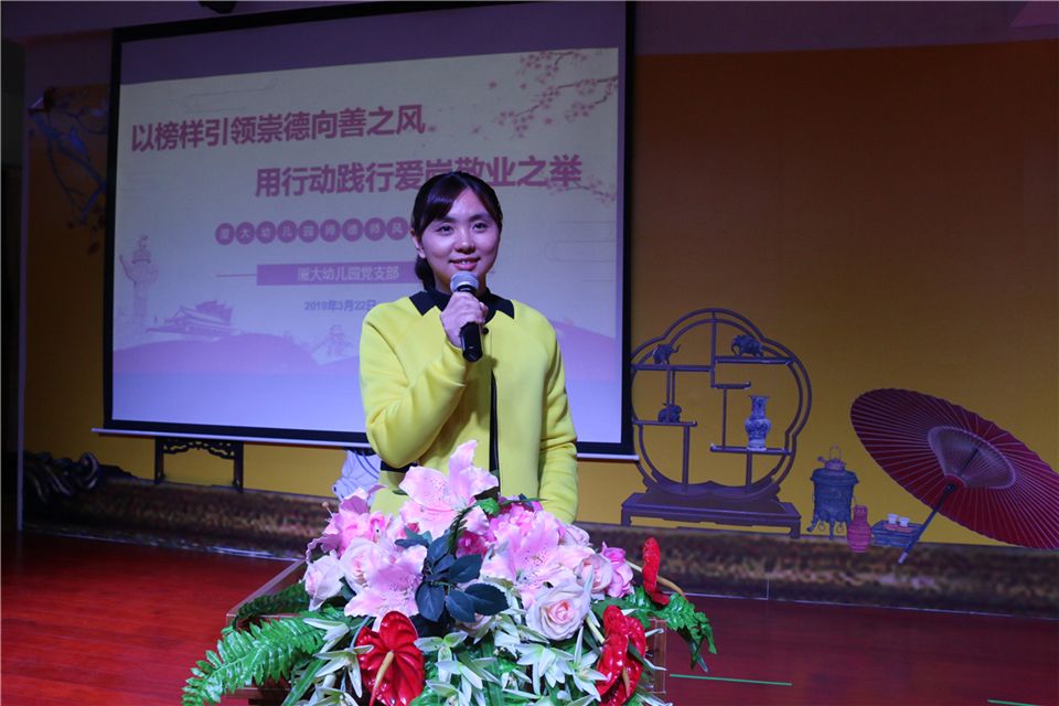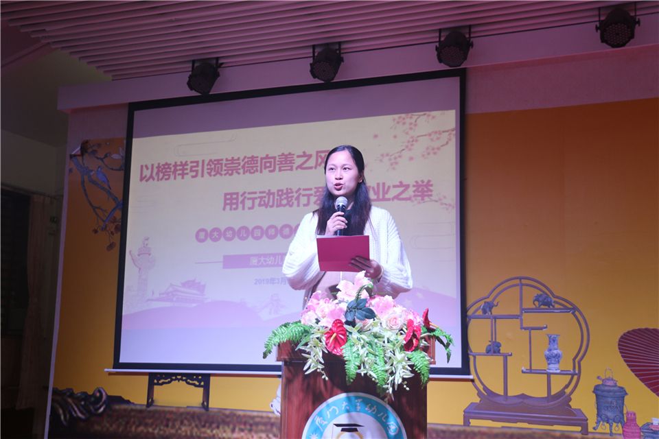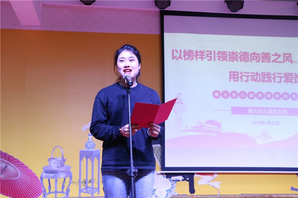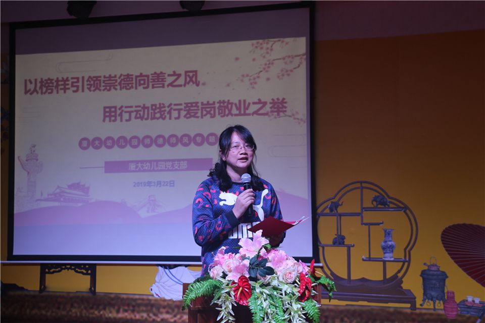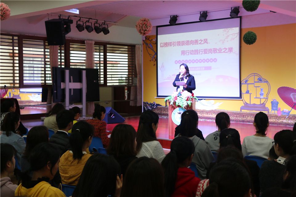 为了进一步落实立德树人的根本任务,提高教师的思想道德修养,营造良好的师德师风氛围,促进教师素质全面提高,2019年3月22日下午,我园开展了主题为“以榜样引领崇德向善之风·用行动践行爱岗敬业之举”的师德师风专题活动。活动由党支部书记郑诚燕主持,全体教职员工参加了此次活动。