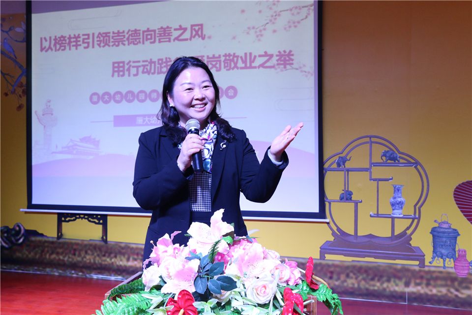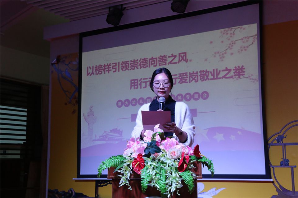 郑诚燕书记表示此次专题会的目的就是希望通过榜样的力量,引领崇德向善之风,并且能在今后的工作中,用实际行动来践行爱岗敬业的最美举动,鼓励老师们作为幼教战线上的一员,应从爱孩子、爱工作做起,一点一滴践行职业道德,并以今天的师德师风专题会为契机,在今后的工作中,每个人都努力让自己成为爱岗敬业的典范,努力做“四有好老师”,让“幼儿教师”这个光荣的称号成为全社会崇尚的榜样。