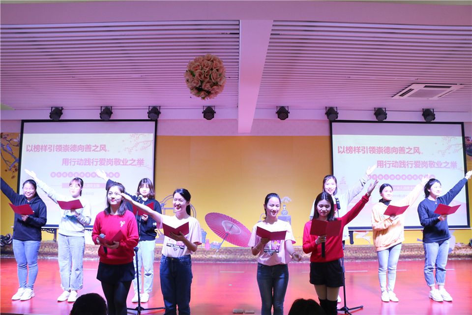 在悠扬的背景音乐中,我园一群朝气富有活力的教师代表们,深情地朗诵着《我是幼儿园教师》,彰显出教师们爱岗敬业、奋发向上的精气神儿,颂扬着“学高为师,德高为范”的铿锵誓言。