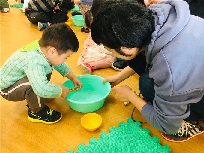 在老师的介绍下,家长们明白了水中取皮筋的游戏是通过让宝宝抓握、二指捏等动作,锻宝宝们的小手肌肉。