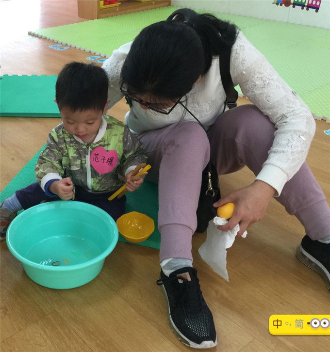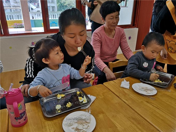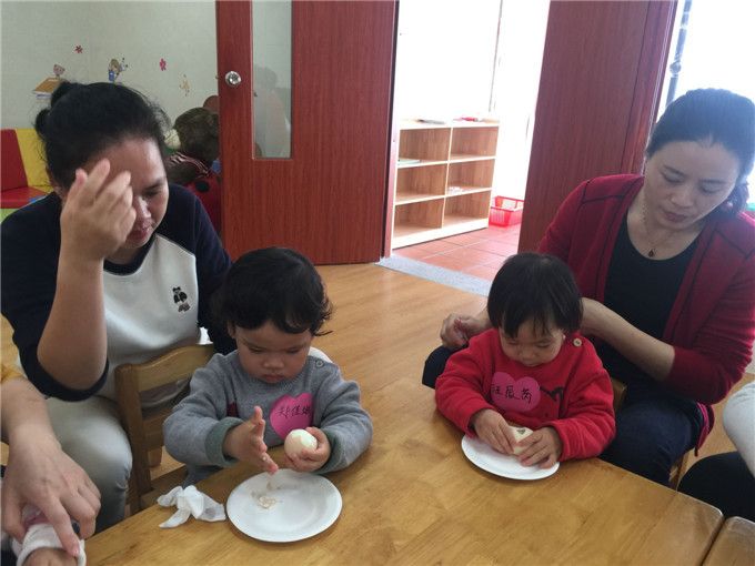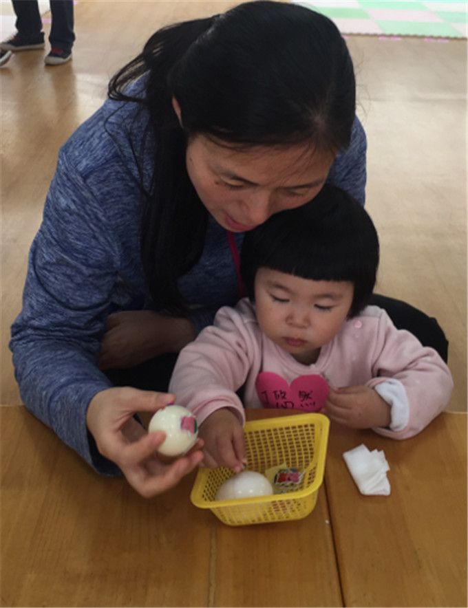 还有一枚鸡蛋哪去了?别急、别急,老师让宝贝们摸一摸,敲一敲,再剥开蛋壳切一切,好吃的鸡蛋嘴里尝——呵呵,真好吃!游戏中,欢笑声、拍手声不断……小小的鸡蛋不但锻炼了宝宝的小手肌肉,还满足了 “小吃货”们的欲望,真是物尽其用呀!