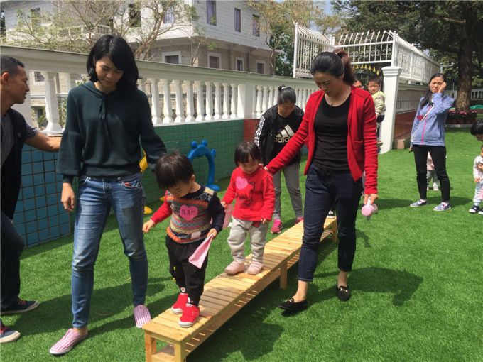宝贝们带着礼物出发咯!途中走过了“独木桥”,顺利地完成了“送礼物”的任务。