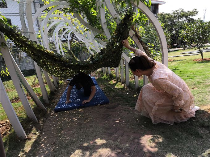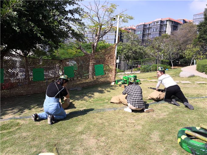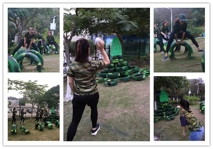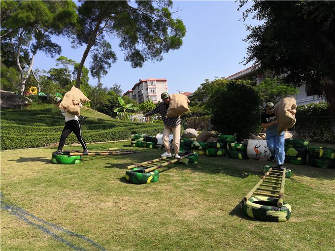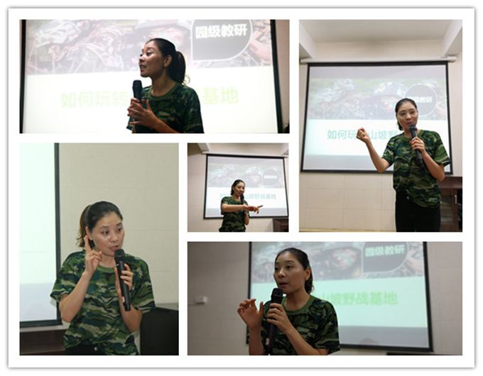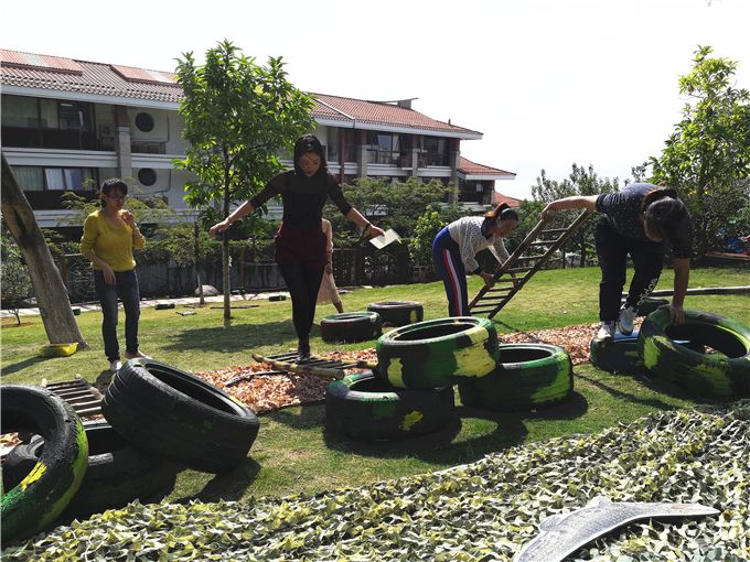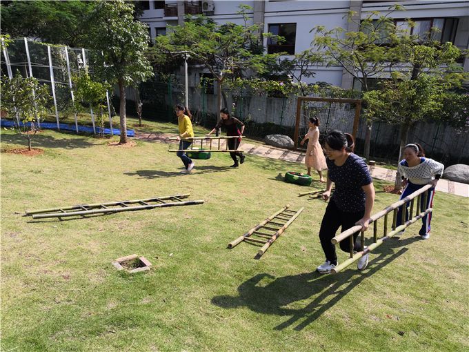 为推动我园山坡户外游戏的深入开展,丰富福娃们山坡野战的游戏内容,“最美幼师”发挥集体智慧,利用轮胎、油桶、竹梯、麻绳、纸盒、迷彩网等废旧材料,在小山坡上打造了八个 “野战游戏”区。王园长带领骨干教师对各个游戏区的玩法进行了实地研讨,以确保游戏的安全性,增加趣味性。
