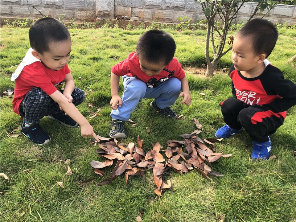 看呀,秋天躲在校园的草地上。“老西老西,我们找到了很多落叶哦,它有红色的、黄色的、绿色的……真美呀!”