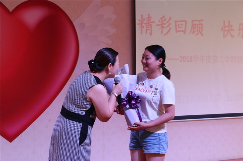接着,园长老师们为将离开幼儿园的两位老师送到鲜花。人们总说,离别是为了更好地相遇,我们也一直坚信着,在未来的某时某刻,当你们看到那一束鲜花时,也会想到在厦大幼儿园收获的温暖长情。