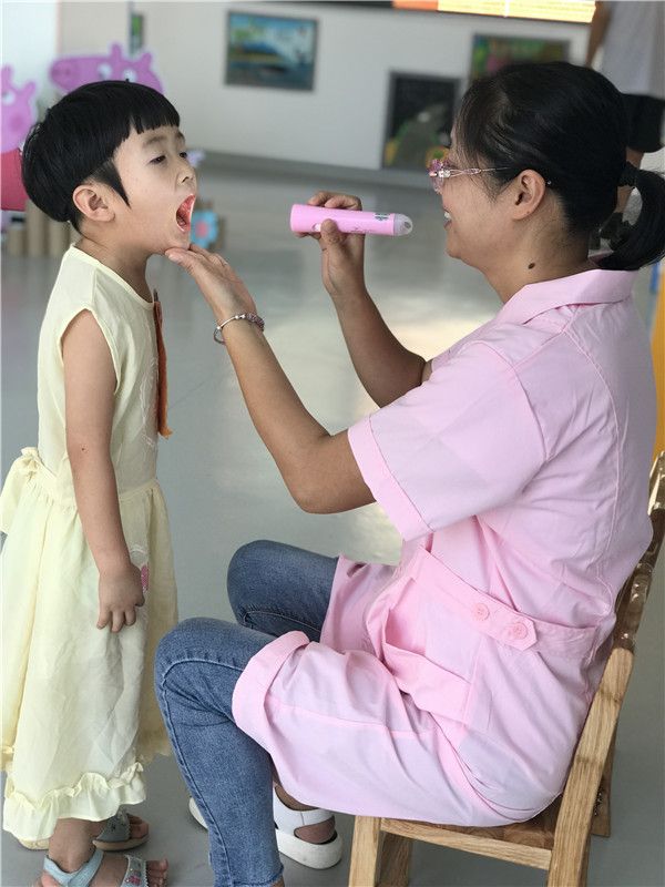 每天,我都要给保安叔叔问好,然后找笑眯眯的保健医生晨检,她给我们摸一摸、看一看,检查得可仔细了!