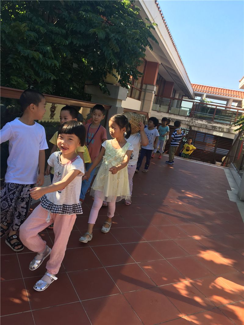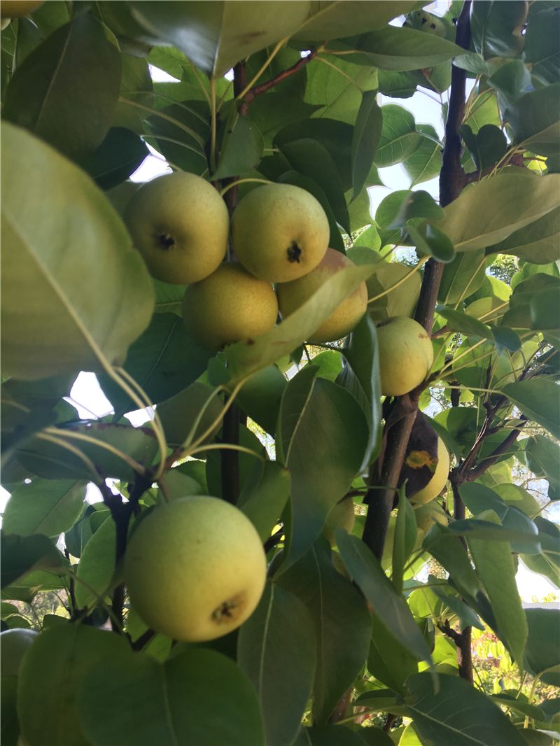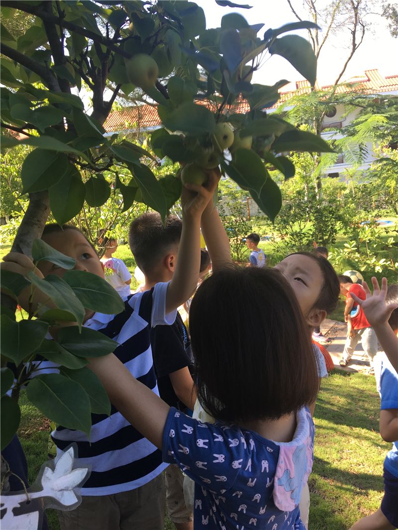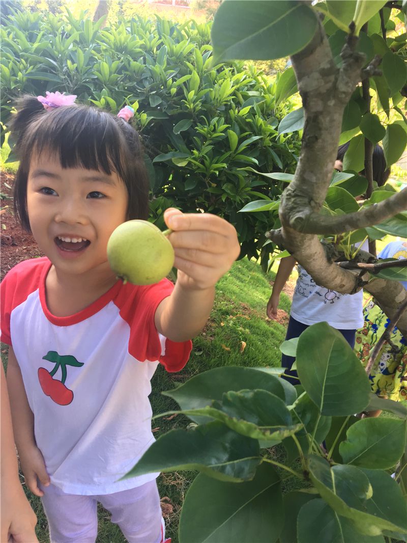 此时,幼儿园山坡上那一个个像绿色小气球的青梨子正挂满枝头,惹得萌娃们口水直流,忍不住要去摘一摘尝一尝鲜。快看!尧尧小手一伸就轻而易举摘到了一个大梨子,那乐开了花的笑容掩饰不住心里的激动和兴奋。边上的几个小伙伴同时去摘一个比较高处的梨子,高个子的小雪有了优势——摘到梨子了啦!不一会儿工夫,小黄筐里装满了青青的梨子。