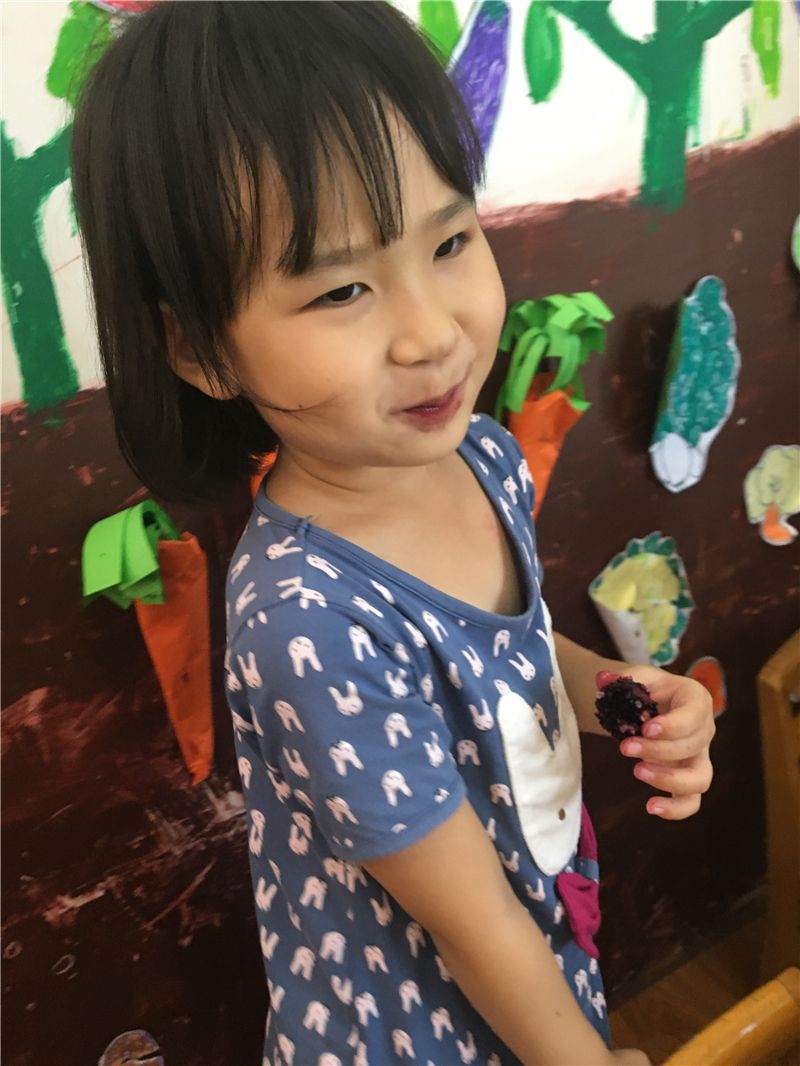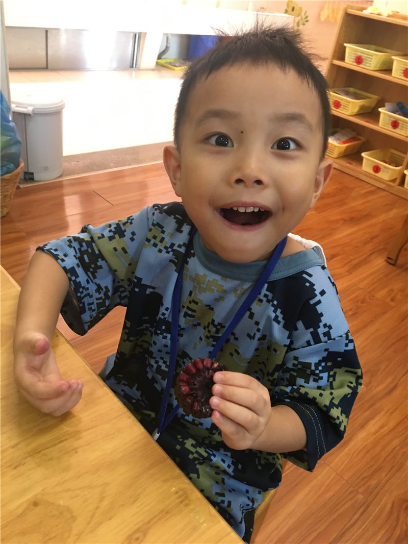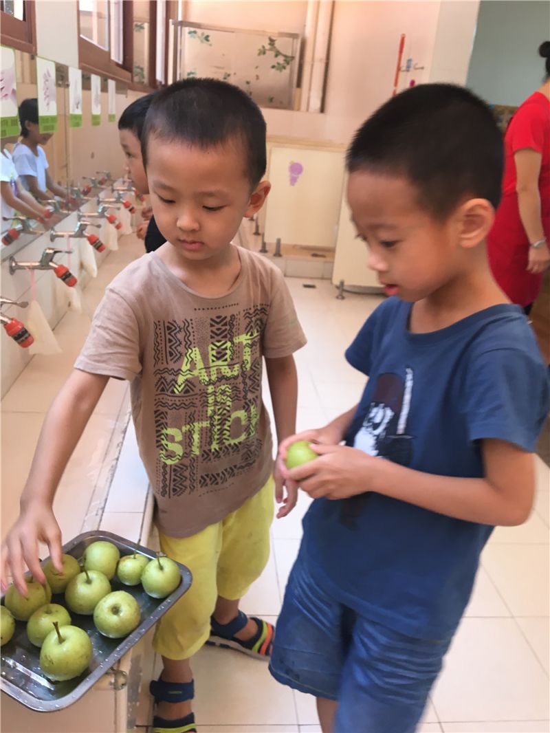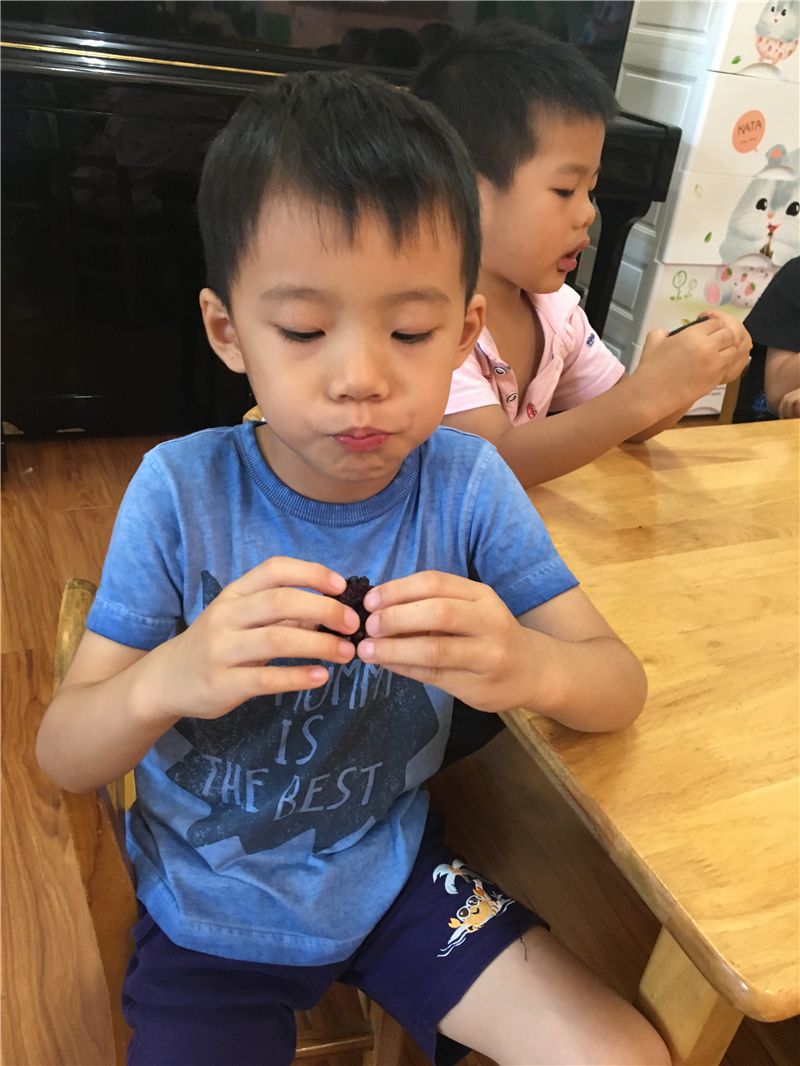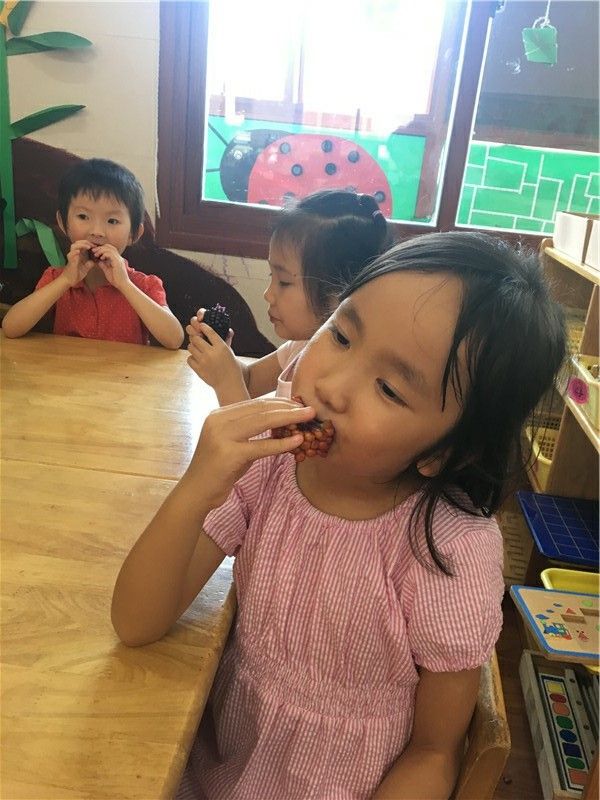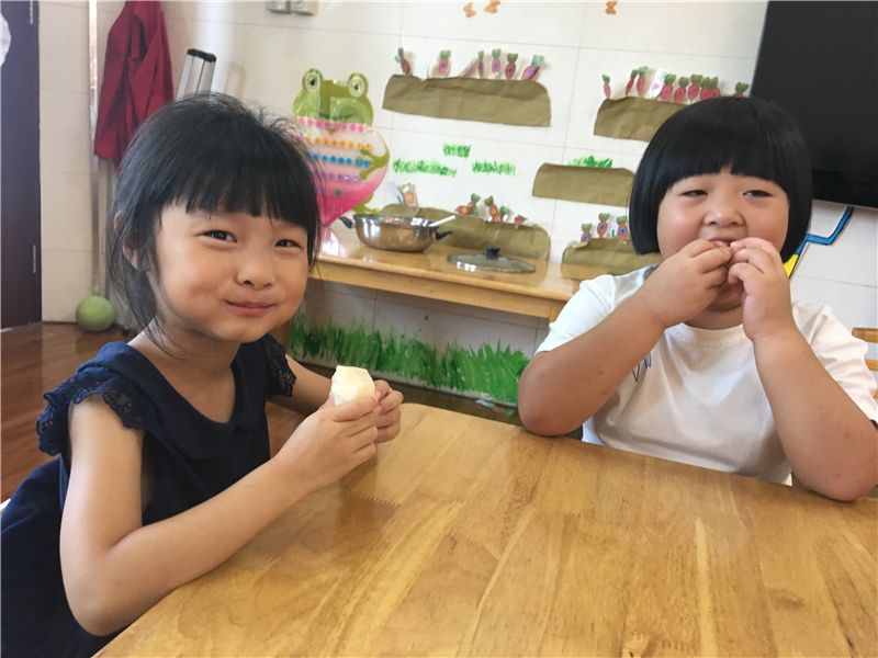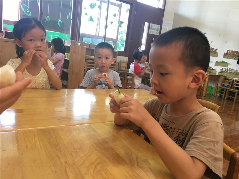 吃完甜玉米再来个小水果,生活真的太美好了!萌娃们一个个吃得津津有味,彷佛是吃到了是这个世上最甜的梨子。看,然然已经沉醉在梨子的清甜中了。
