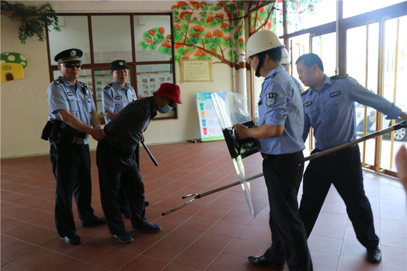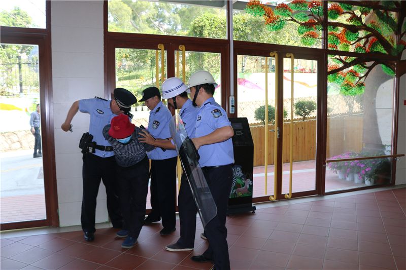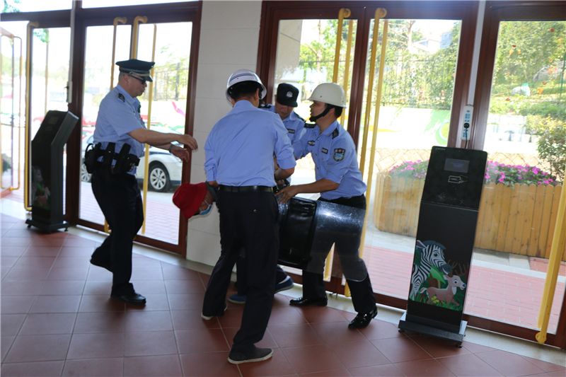与此同时,幼儿园反恐防暴小组成员马上手持长叉、棍棒、盾牌、警棍等器械合力将“歹徒”制服。“110”迅速来园,将“歹徒”带走,幼儿园宣布解除警报。