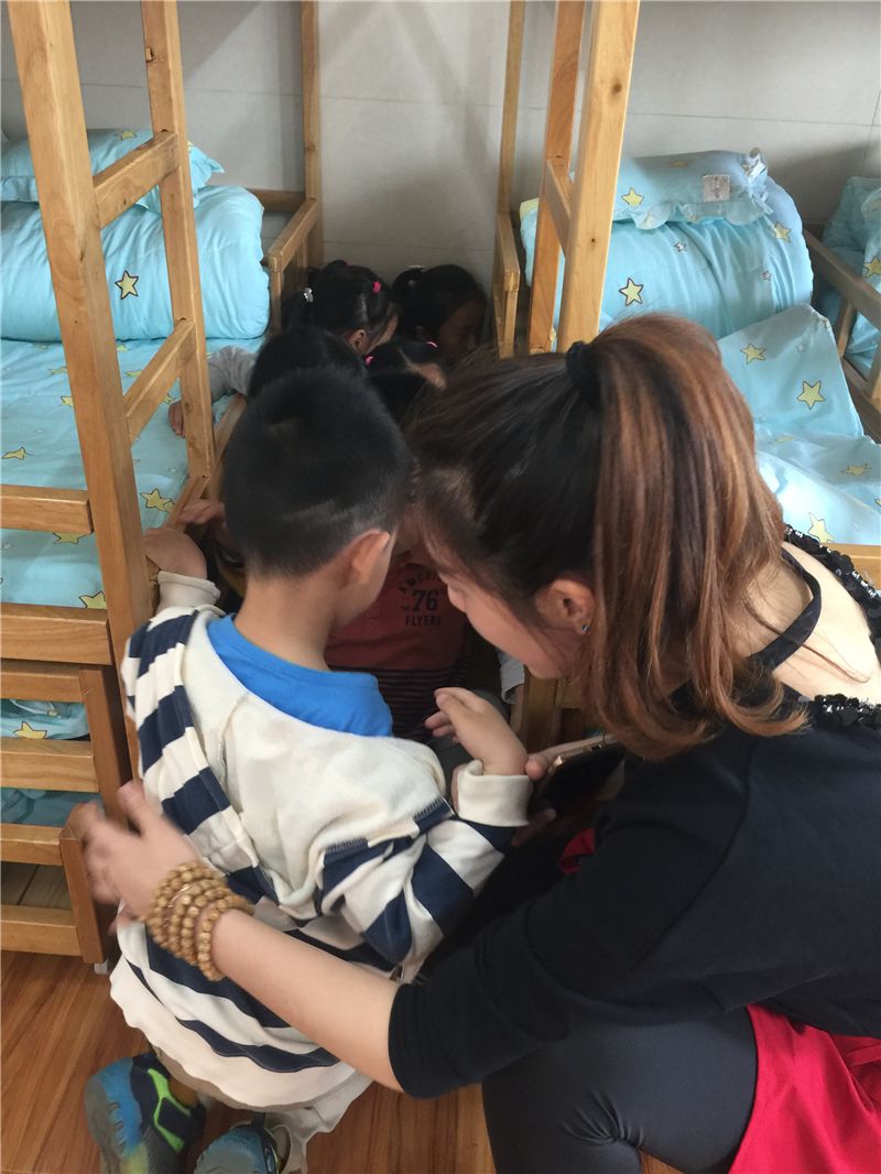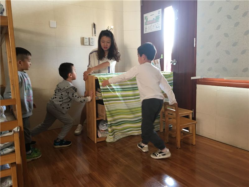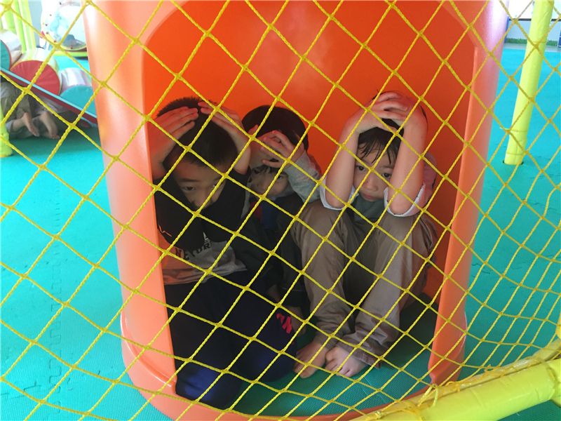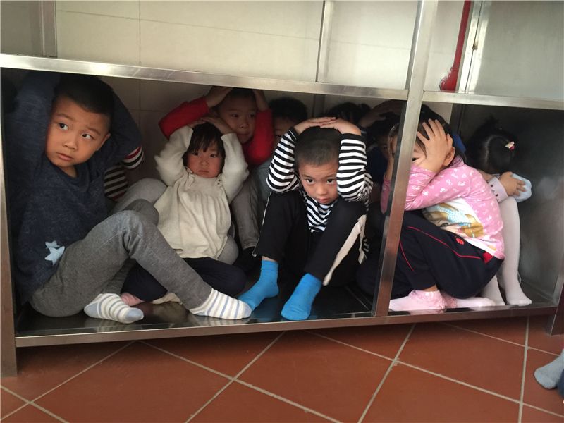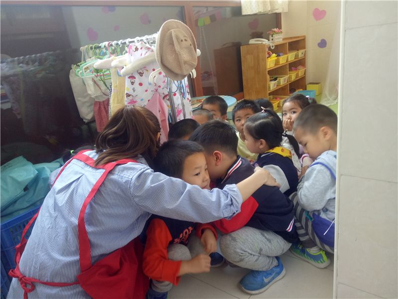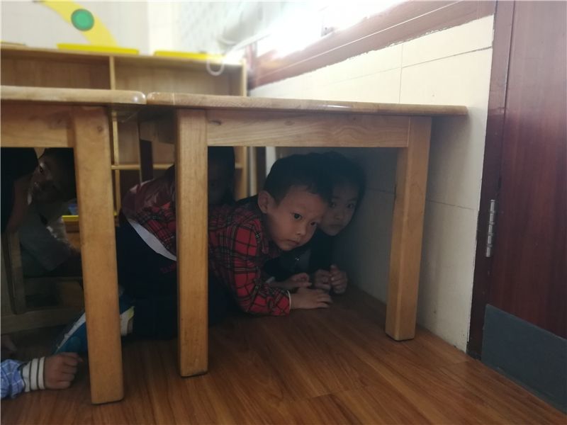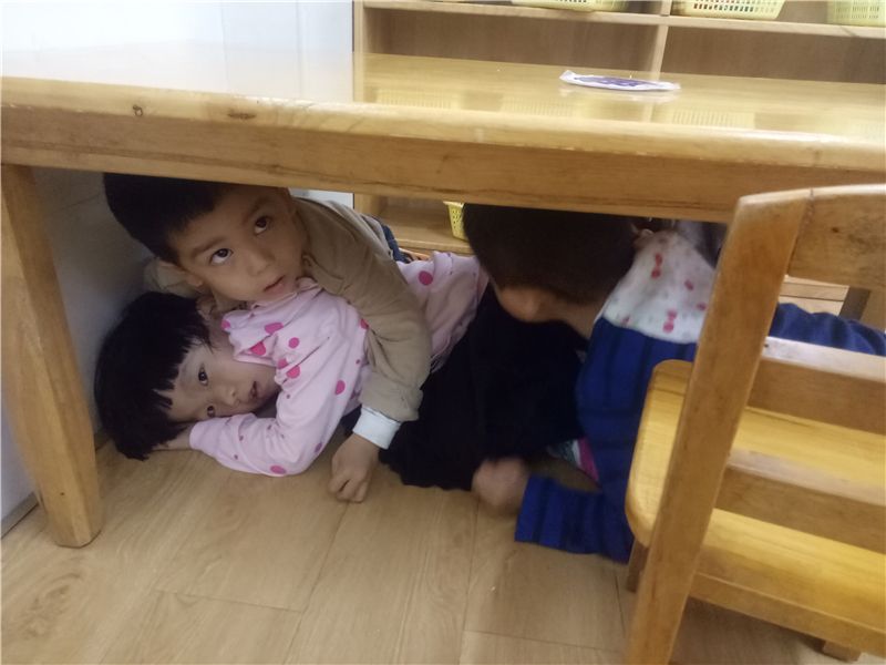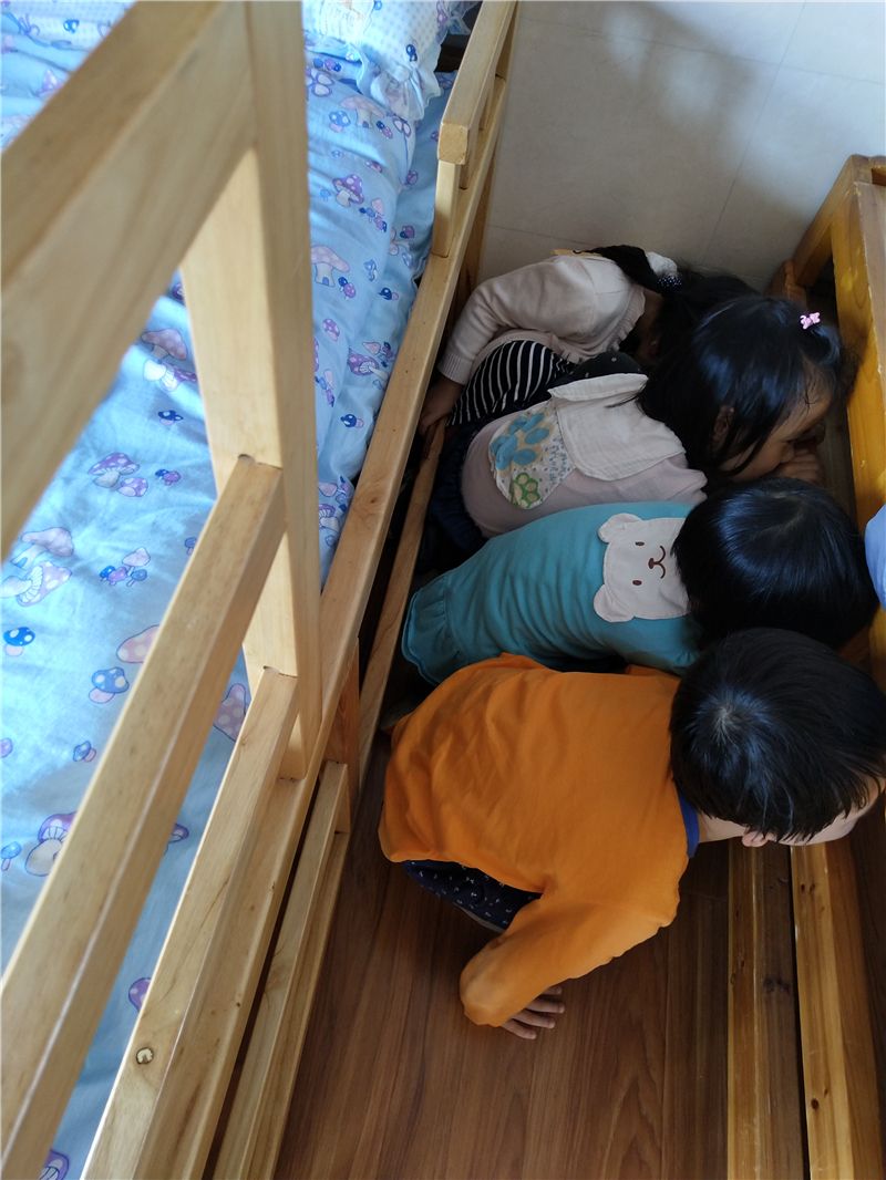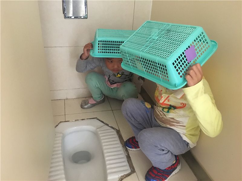 孩子们有的躲在桌底下,有的躲在床边,有的躲在玩具柜里面,有的躲在厕所……