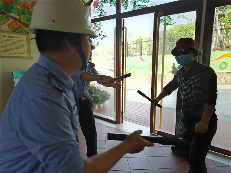 一名“歹徒”欲强行闯入幼儿园,保安例行询问并与其周旋。