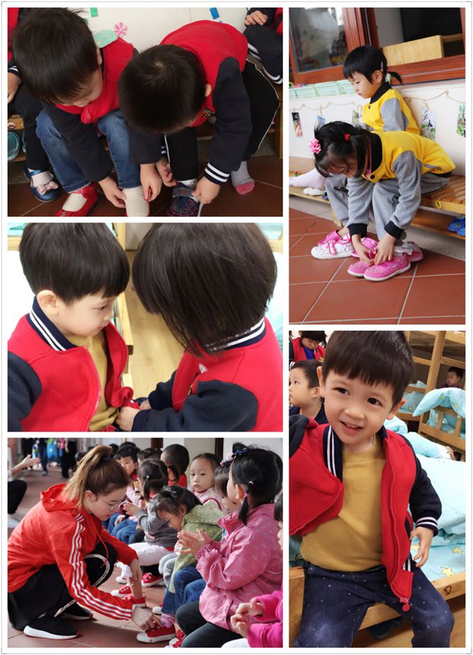 午睡起床啦!快速穿好衣服,整理好鞋袜,我们是自我服务的小能手!