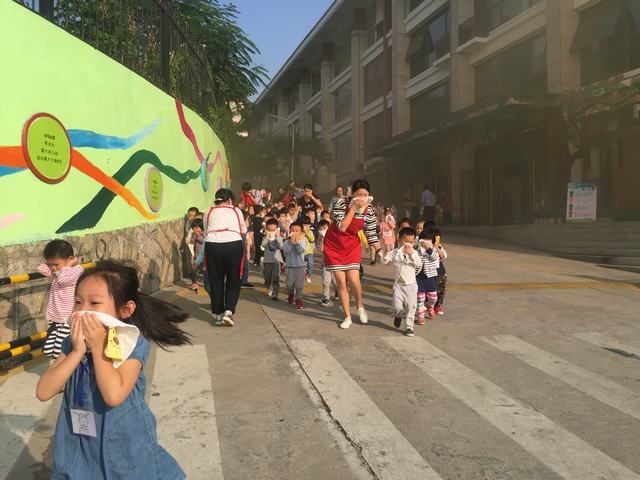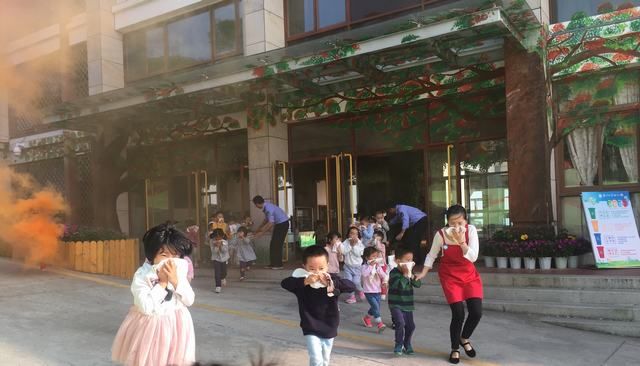 伴随着阵阵急促警报声,消防演练开始了!瞧,孩子们沉着应对“突发状况”,随手拿起小毛巾或用衣服等捂住自己的口、鼻,弯下腰,沿着走廊、楼梯快步行进……短短不到2分钟,全体人员全部按照既定路线有序疏散,并撤离到安全地带。