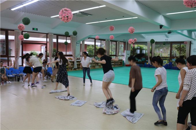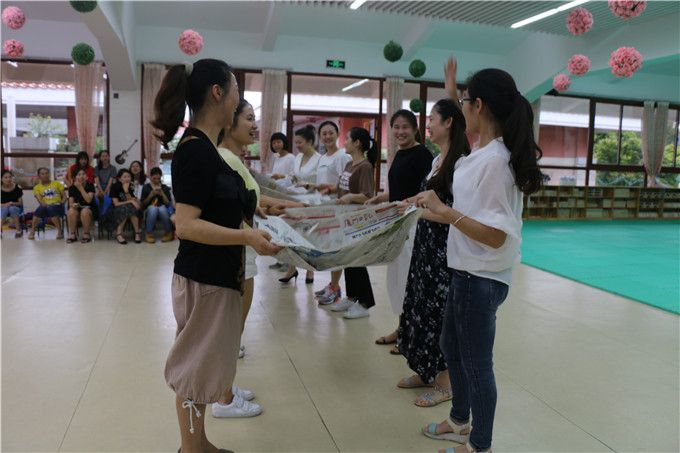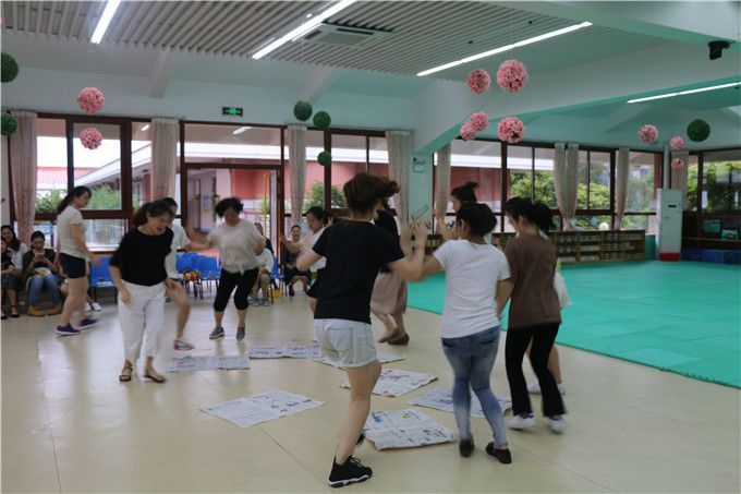 小段老师们利用报纸一物多玩,将体育游戏融入到故事情境中。将报纸变出山洞、过河石等,解决了游戏中的各种障碍,让瞬间变成“孩子”的老师们玩的不亦乐乎。