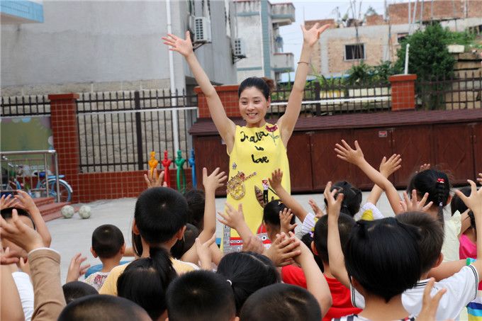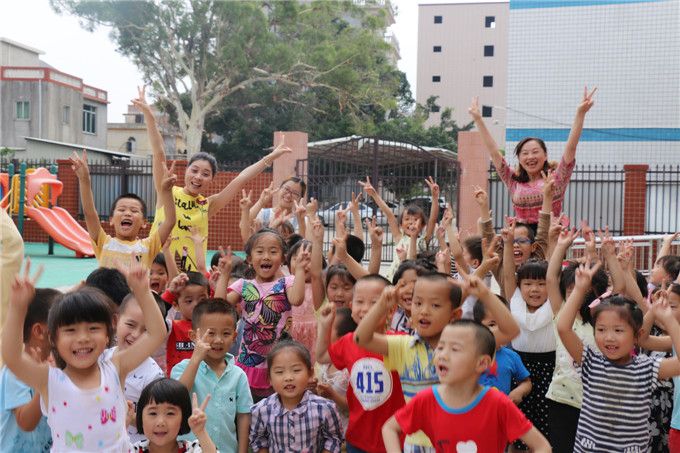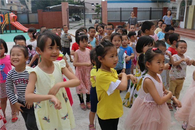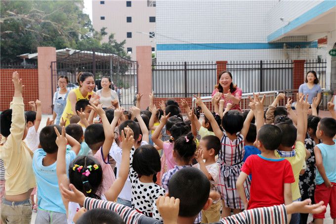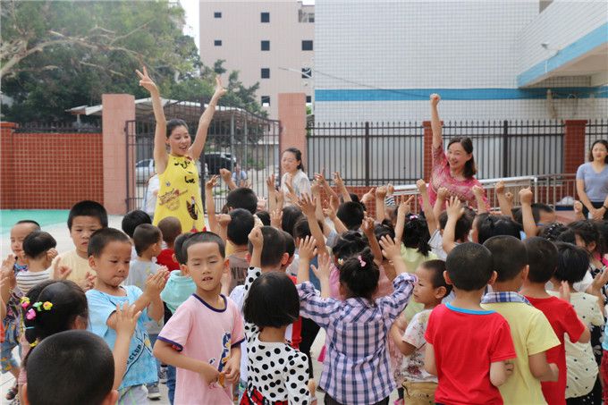 欢快的音乐响起来喽,来来来,我们一起做游戏吧!在美美老师和范老师的带动下,孩子们的陌生感慢慢地消失了,开始积极加入互动的队伍中,开心地跳啊乐啊!此时操场上充满了孩子们的欢声笑语。