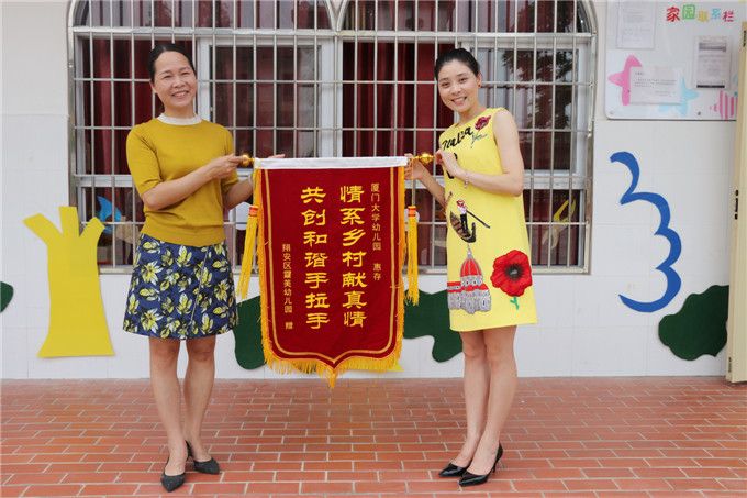 自2012年12月以来,厦大幼儿园与霞美幼儿园成为帮扶结对子学校,已经手拉手走过近5年时光。霞美幼儿园王园长介绍了本学期园里的师资、生源以及教学等具体情况,感恩我园多年来在教学示范课、教玩具等方面给予的支持与帮助,为此特赠送锦旗以表谢意。