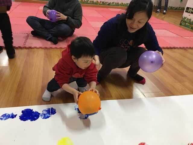 25—28个月龄段的宝宝对颜色特别敏感。王老师设计的《气球乐》,在让宝宝感受气球特性的基础上,进一步引导宝宝玩气球:让气球跳舞,夹气球、用气球印画等等。