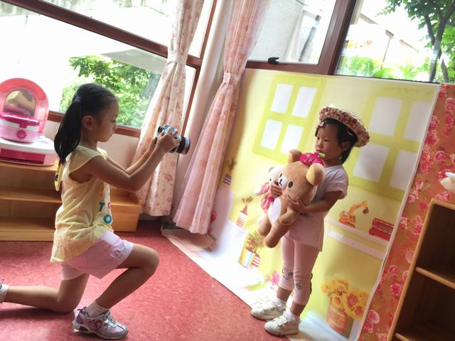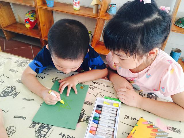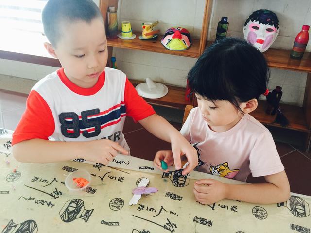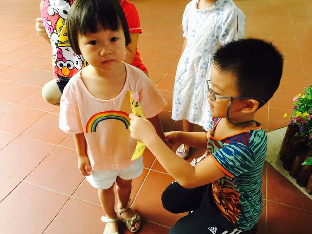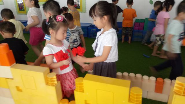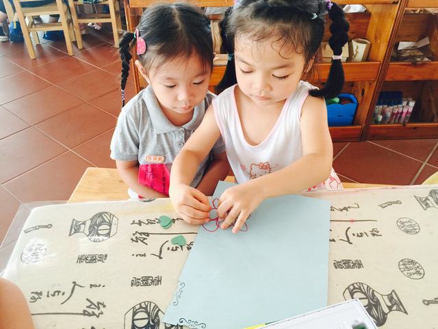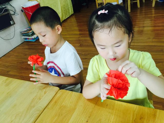 这是哥哥姐姐做手工的地方,来,我们一起做手工吧,“把它团成团就可以粘住了,你真棒!”“我画朵花送给你吧”“这是姐姐做的花,等会送给你们哦。”