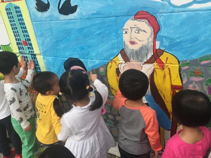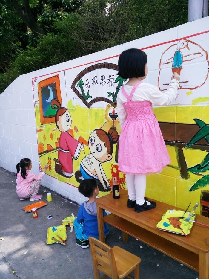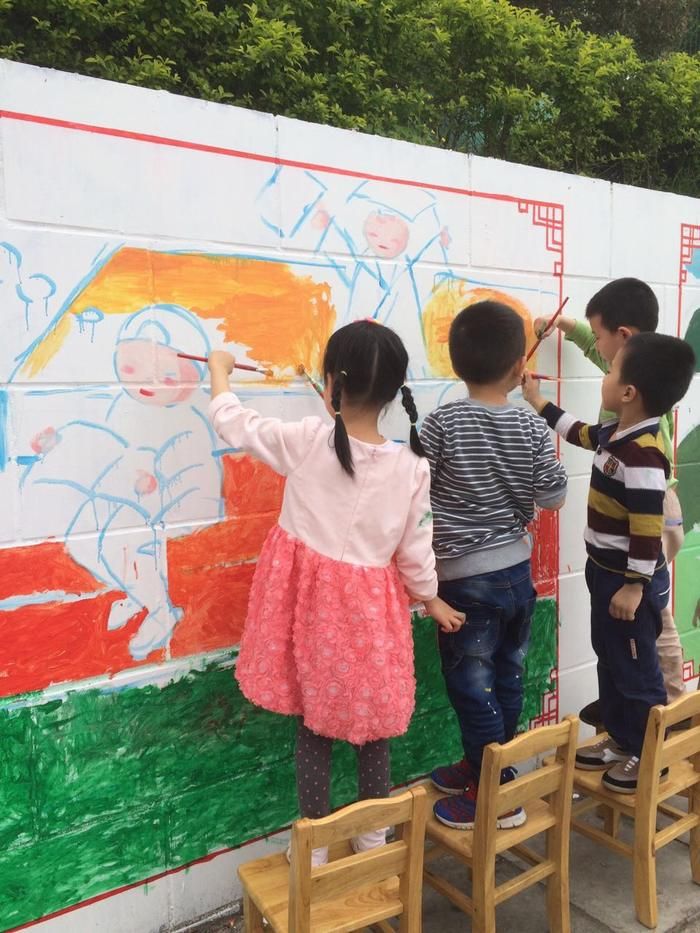 在幼儿园园门口,有一道围墙,能干的小朋友和老师把这堵看起来不怎么样的围墙变成了充满生机、童趣和富有教育意义的“涂鸦墙”——本场涂鸦的主题是“成语典故与品德教育”,是小朋友们和老师一起构图、一起完成的哦!