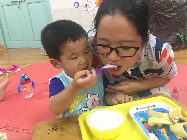结束了有趣的户外的游戏,到了制作香蕉奶昔的时间了,当然要先把小手洗干净了。宝宝们一听说要准备去制作香蕉奶昔,无需过多提醒,都自觉地把小手洗得干干净净的。老师介绍了制作奶昔的步骤和材料后,宝宝们按耐不住,想自己动手了,OK,开工!每人一个餐点盘,一根香蕉,开始动手忙起来了,剥开香蕉,有的孩子迫不及待的吃起来了。“宝贝们请等等,香蕉如果吃完了,我们怎么做香蕉奶昔呀?”听到老师的提示,宝宝只好再等等了,有的宝宝实在受不了,就凑到自己的盘子上闻一闻,好香啊!惹得爸爸妈妈们忍俊不禁地笑开了。而后爸爸妈妈和宝宝们一起切香蕉片、倒酸奶、搅拌奶昔,不一会儿,酸甜可口的香蕉奶昔出炉啦!孩子们迫不及待地品尝自制的香蕉奶昔,还会主动跟家长们分享。有位妈妈不禁感叹道“原来香蕉加了酸奶以后,变成更甜,而且更滑了,连平时不爱吃香蕉的宝宝都吃地津津有味。