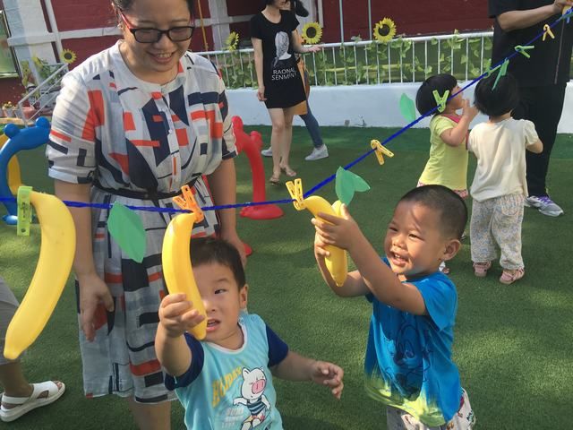 近日,厦大幼儿园早教基地开展了一场别有韵味的公益早教亲子活动《香蕉奶昔》,目的是让宝宝们结合各种感官进行感知、操作,和爸爸妈妈一起制作“香蕉奶昔”,知道水果还有其它的吃法,培养了宝宝们的动手操作能力,增进了家长与宝宝之间的情感沟通,融洽了亲子关系! 活动在“魔法箱里摸一摸、猜一猜”的游戏中拉开了帷幕,宝贝们通过看一看、摸一摸、闻一闻、捏一捏,充分感知了香蕉的各种特点。紧接着的大运动环节“小猴摘香蕉”更是让宝宝们大显身手,一只只 “小猴子”灵活地走过小路、钻过山洞、你追我赶地摘香蕉,乐此不疲!而在一旁的家长们看到平日依偎在自己怀中的宝宝如此能干,更是乐开了怀!早教亲子师及时与家长进行专业的指导,让家长明确这个环节主要是练习宝宝纵跳触物的动作,训练宝宝的腿部弹跳力,发展他们动作的协调性。