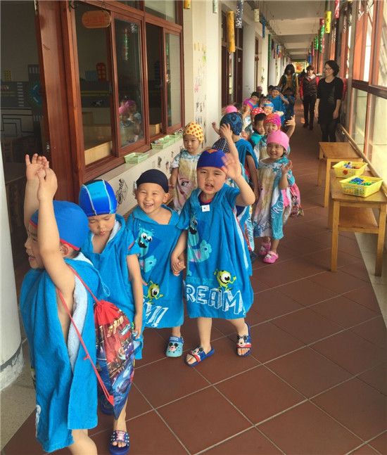 今天,孩子们来得格外早,来园的路上又蹦又跳,和小伙伴们有说有笑地来上学。刚踏进班级的大门,小朋友们就按耐不住心里的激动之情,像一只只小喜鹊叽叽喳喳地与其他小朋友们说着一会儿游泳的事情。