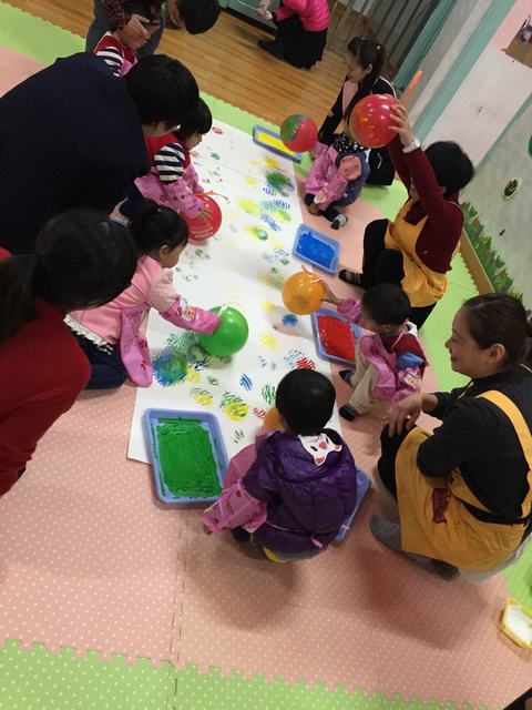 研讨活动在我园黄诗韵老师执教的亲子活动《气球玩玩乐》中开始了。本次活动的对象是34-36个月的宝宝和教养者,以五颜六色的气球为主要材料开展活动。让宝宝动手探索气球,充分感受气球的弹性,从中发现气球奥秘的机会,旨在教会爸爸妈妈运用“身边物”有意识地引导宝宝进行观察、互动游戏或艺术地创作。活动中,宝宝们在爸爸妈妈的引导下,以极大的热情兴致勃勃地参与到活动中,通过摸、拍、抱、捏、踢等不同的方式感受气球的特性,爸爸妈妈们也乐得合不扰嘴。最后通过气球拓印,提供给宝宝与同伴相互合作的机会,培养宝宝对艺术的兴趣。