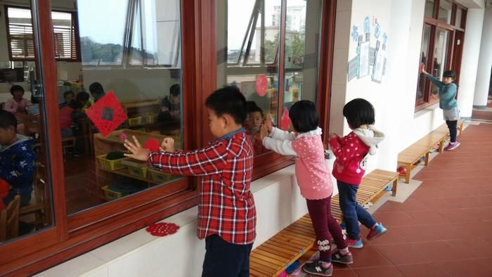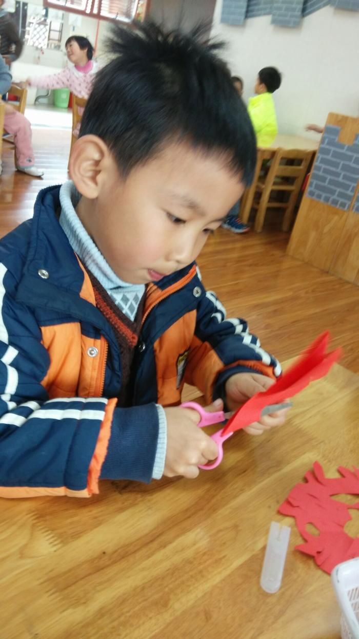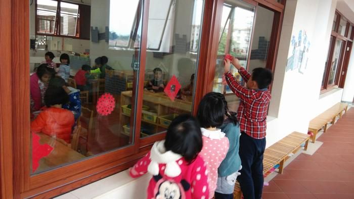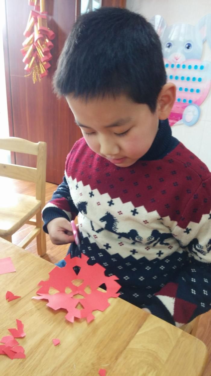 小方纸,红艳艳。折一折,叠一叠,左剪剪,右剪剪,轻轻打开瞧一瞧!呀!变出漂亮的小窗花。小朋友们熟练地用着一把把小剪刀,三下五下变出了一张张漂亮的窗花。“红色的窗花真漂亮,我想贴在教室的玻璃上,好像过年哦!”“我剪的窗花,圆圆的,像一个红灯笼。”“我的窗花里剪了个小爱心,祝愿小朋友新年里相亲相爱。”……过完年长大一岁的小朋友们,那张小嘴儿也越来越甜了,你一言我一语的,说着甜蜜蜜的话儿。