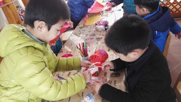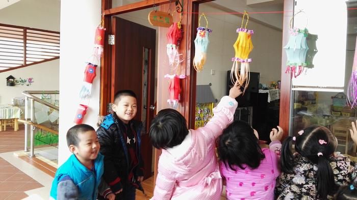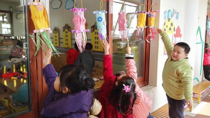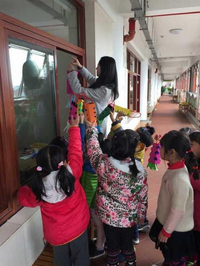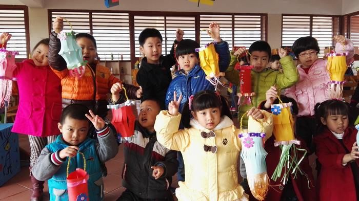 瞧!心灵手巧的小朋友们用一张张五彩缤纷的彩纸,变出了一盏盏漂亮的花灯,悬挂在班级廊道上,随着海风微微地飘荡着。“今年是猴年,这是我做的金猴花灯,上面的小猴子正在和我们拜年呢!”“大红灯笼是我做的,红红的看过去就像热热闹闹过大年一样。”“我的花灯很特别哦!我在花灯上写上了祝福的话哦,祝大家春节快乐!”“我不会写字,不过我会画画,我在我的花灯上画上了送给小朋友的春节礼物哦!”……孩子们每每在休憩时间,都会在廊道上欣赏漂亮的花灯,猜着花灯上小朋友画的小礼物,仿佛继续在幼儿园里过着热闹的大年。