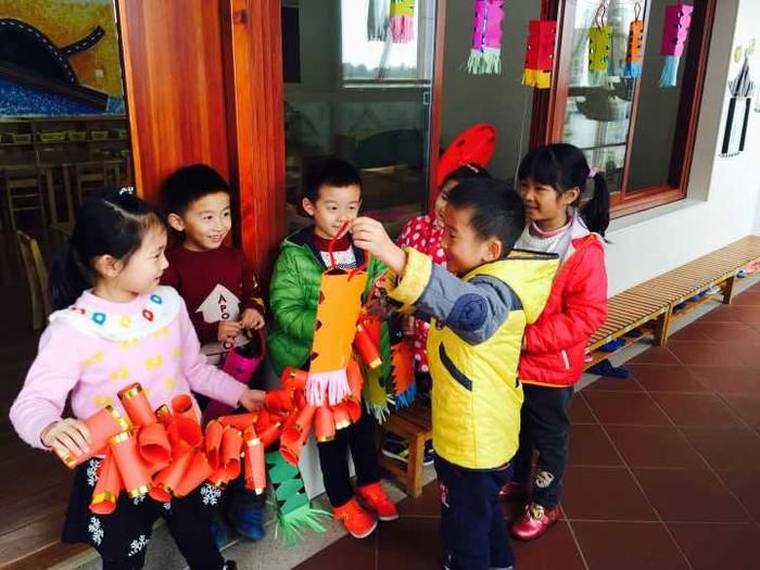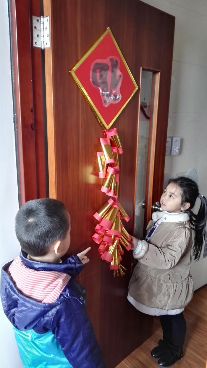 噼里啪啦,噼里啪啦,放鞭炮喽!哟!原来一群小朋友正拿着一串串大红鞭炮,在廊道上欢快地跳着,嘴里还不时地叫着:“放鞭炮喽!过大年喽!”他们还在回味那热热闹闹的年味呢!“我们的鞭炮要挂在教室大门口,这样的话,其他班小朋友看到了也会觉得很热闹。”“对对,我们的鞭炮都是不一样的哦,我们在每个鞭炮上还画上了祝福的话呢!不信的话,你们都去看一看,猜猜我们都画了什么呢?”孩子们兴奋的声音叽叽喳喳的,在这充满寒意的春季,显得格外的温暖。