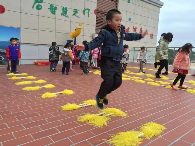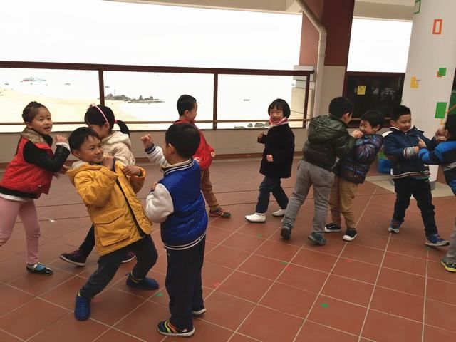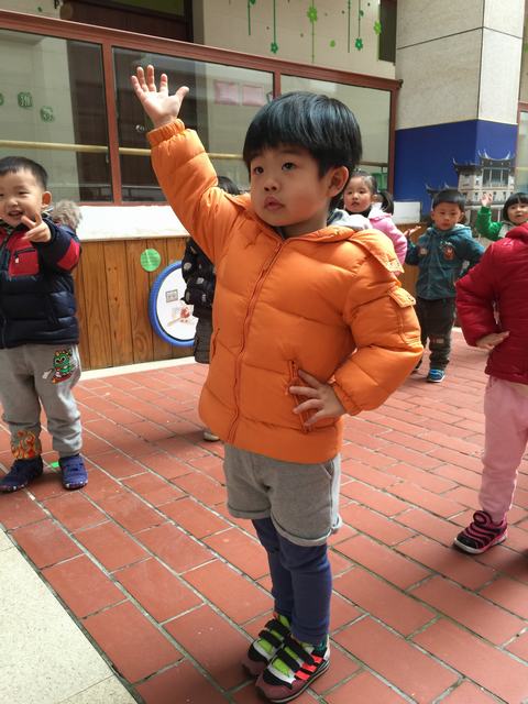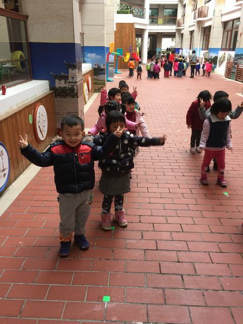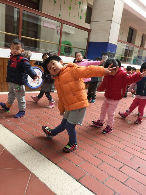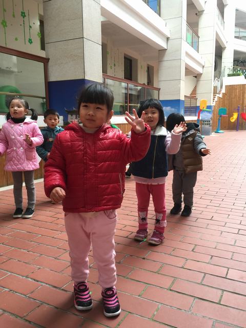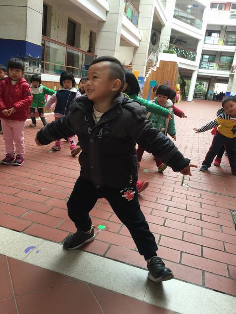 虽然新的学期才开始了短短的一周多时间,但我们能干的小朋友们都已经能够跟随音乐的节奏,灵活地变化各种动作,活动身体的各个部位。我们每天都要带着孩子们做早操,以往总会发现,做早操的时候,有的小朋友站在那里一动不动,或者是跟小朋友一起嬉戏打闹,幼儿园的小朋友年龄小,注意力更是容易被其它事情转移走。所以,上学期末编排这学期的新早操时,各个年段老师一起群策群力,从音乐的选择、动作的编排、情景的创设都紧抓小朋友的兴趣点,严格按照3—6岁幼儿身心发展特点和规律。每个年段聪明能干的老师们都编排了一套适合本年龄段小朋友动作发展水平、孩子们非常喜爱的趣味早操。托班宝宝一会儿“变”成可爱的泡泡、一会儿“变”成可爱的小兔子,咦,那边还有一只可怕的狼外婆哦!简单的出场队列,小班小朋友们用玩开火车的游戏轻松完成。四个领队的“火车头”纷纷提醒排在自己身后的“小车厢”说:“大家快快站整齐,小火车要出发啰!”“琪琪,你要紧紧跟在我后面哦,不然小火车会断掉的!”“大家快来检查一下车轮吧,左边转一转、右边转一转。”就连枯燥乏味的操节融入童话故事,也变得丰富有趣起来。“小兔子点点头,长长耳朵甩一甩,红红眼睛转一转……”小朋友们一边跟着音乐念着朗朗上口的儿歌一边认真地模仿小兔子的各种动作,就这样开心地把头部运动、上肢运动、体转运动、体侧运动、跳跃运动……都认真完成了!“舟舟,这个动作脚尖要翘起来!你看,就是像我这样!”“恩恩,你的小兔子耳朵怎么这么短呢?是一只短耳朵兔子吗?”“哈哈,我把胳膊伸直就变成长耳朵兔子了!”中班段心灵手巧的老师们,将废旧的PVC管自制成可爱的小鞭炮,搭配浓浓中国风的音乐欢天喜地舞起来,“七个隆咚锵咚锵,炮竹响连天!”活力动感的大班段小朋友动作规范地做着第八套幼儿广播体操,“大公鸡,喔喔叫!你们看我头顶的鸡冠好看吗?!”“大象伯伯慢慢走,伸伸鼻子仰仰头!”