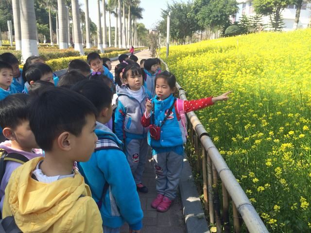 春天的灯塔公园真美呀!成片的油菜花泛着骄傲的一抹鹅黄,迎着和煦的春风来回摆动,那满眼的黄绿色,温暖着我们的眼。花海上,成群结队的蜜蜂,呼扇着黄色的翅膀,就像和油菜花在窃窃私语地商量着,要如何欢迎我们这些远道而来的小客人似的。和煦的春风、清新的空气、盛开的油菜花,还有那不知名的小草吐出的嫩芽,处处都让孩子们感受到浓浓的春的气息。春天在哪里?孩子们说,春天在公园里、在油菜花里、在柔软的小草里……我说,春天在孩子们的笑脸上,在孩子们的笑声里……