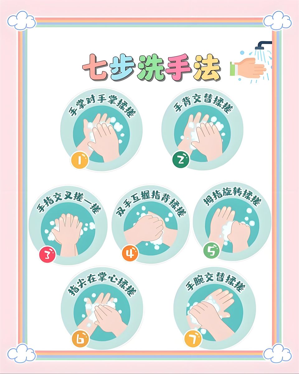 勤洗手,会洗手:教育孩子使用“七步洗手法”,尤其是在餐前、便后、外出回家及接触公共设施后。