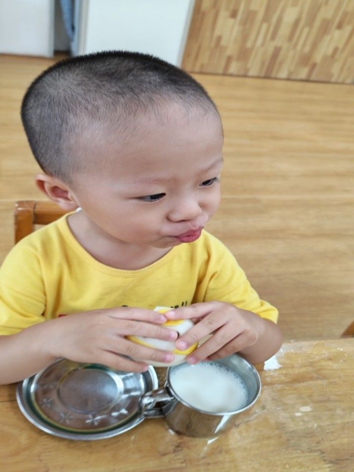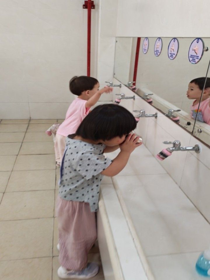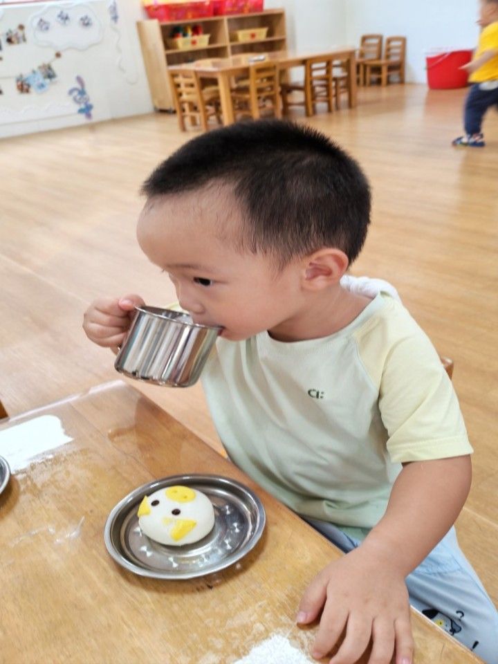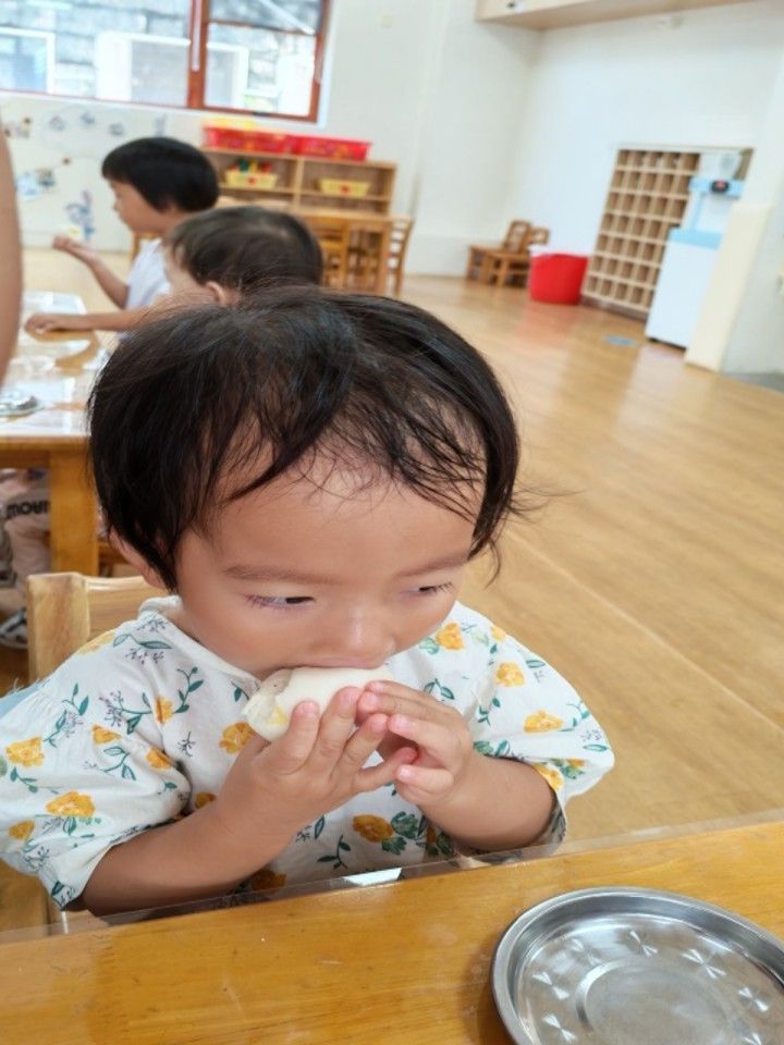 小手在水龙头下搓洗着,小脏手变干净了;宝贝踮着脚学着自己端小点心,喝着桌上的牛奶,奶渍沾在嘴角也不在意;眼里闪着分享的光。宝贝们学着自己擦嘴、漱口,笨拙的动作里藏着成长的第一步。