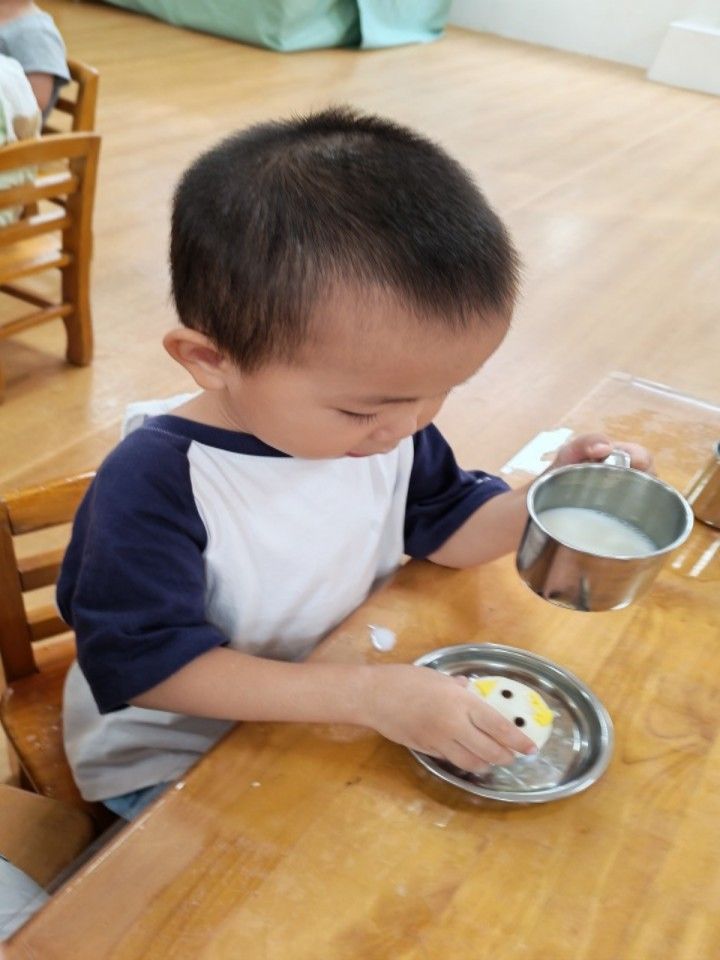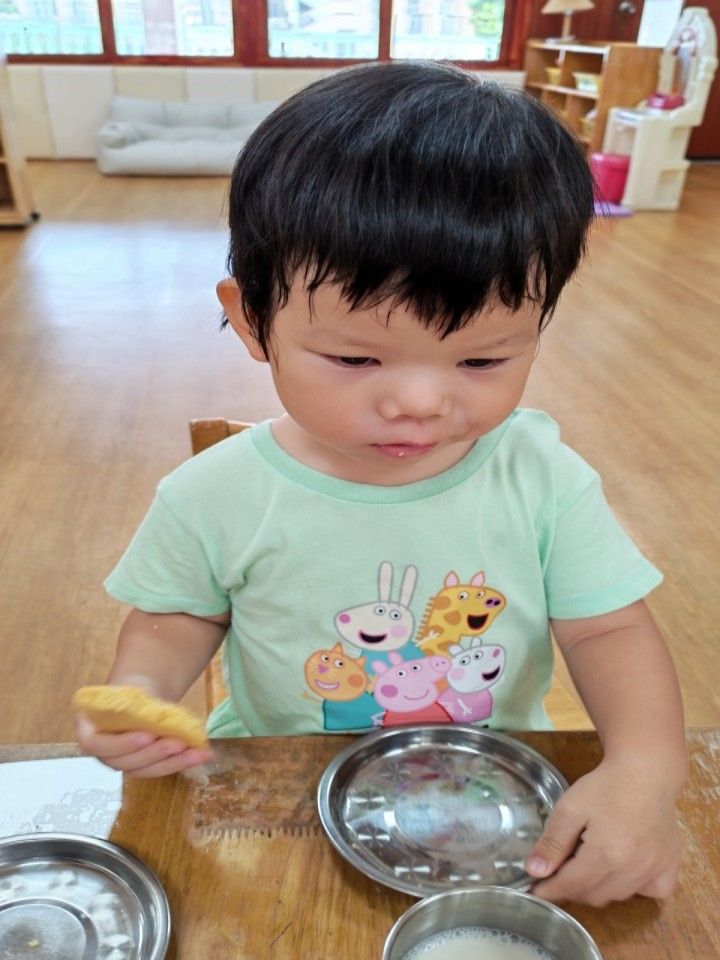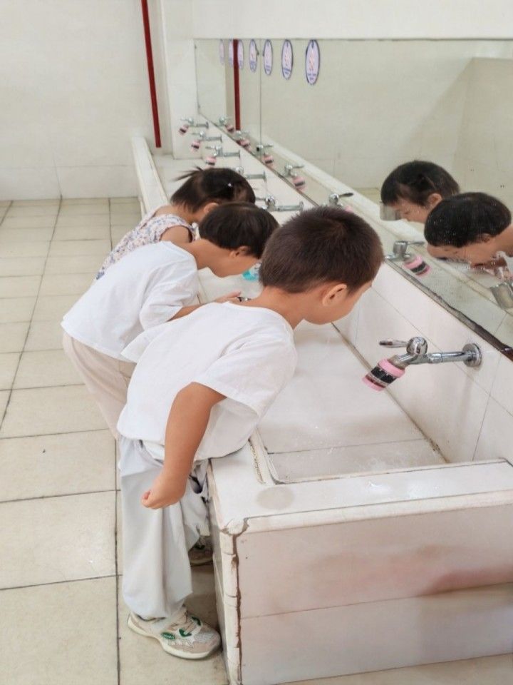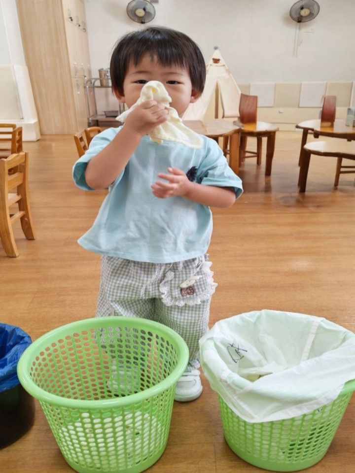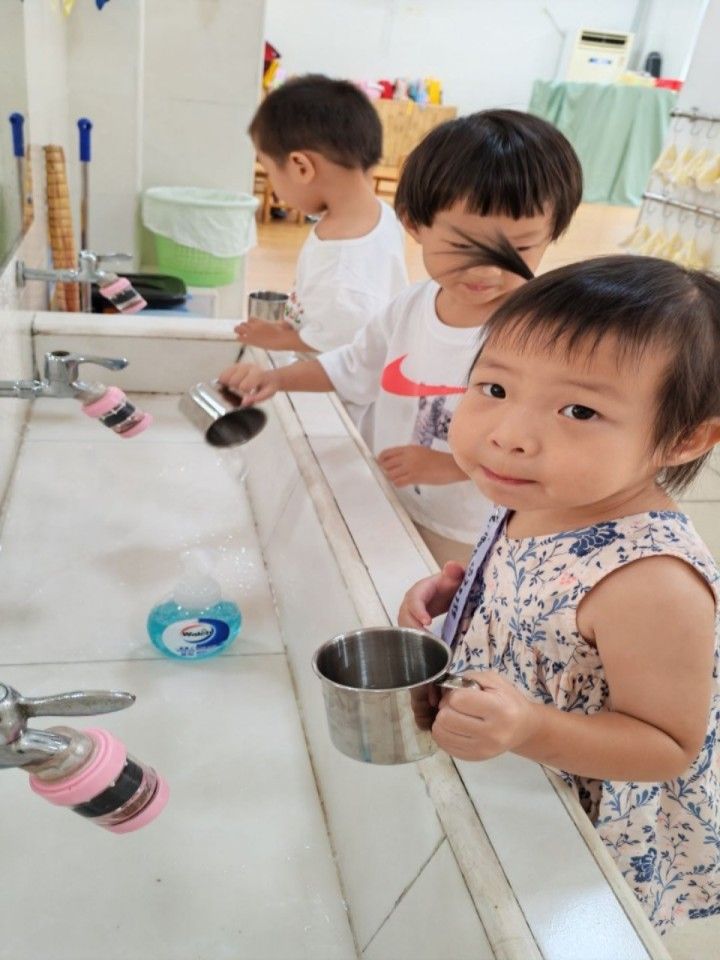 小手在水龙头下搓洗着,小脏手变干净了;宝贝踮着脚学着自己端小点心,喝着桌上的牛奶,奶渍沾在嘴角也不在意;眼里闪着分享的光。宝贝们学着自己擦嘴、漱口,笨拙的动作里藏着成长的第一步。