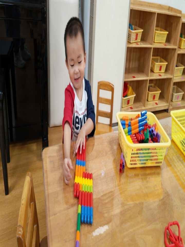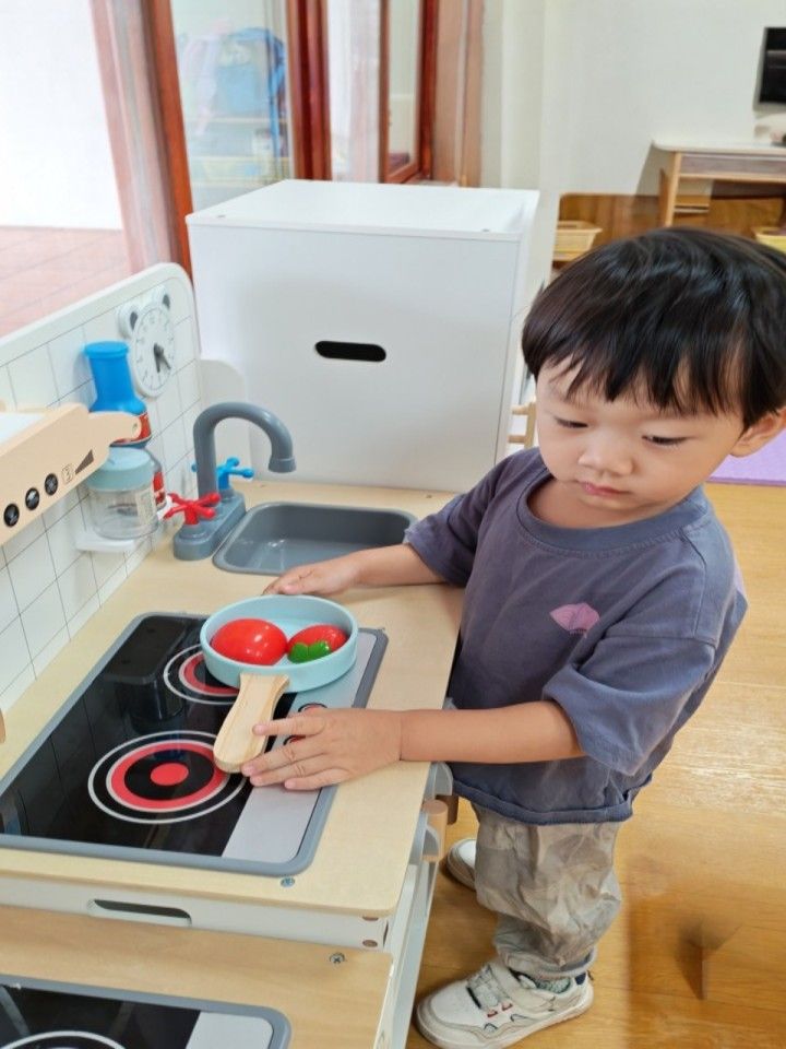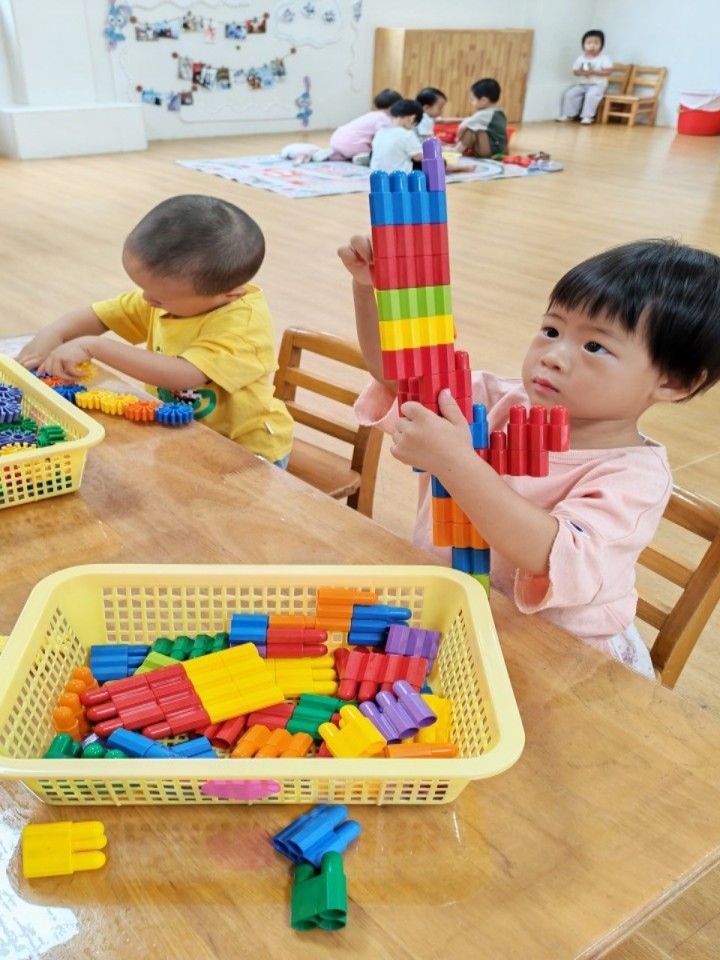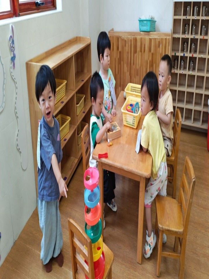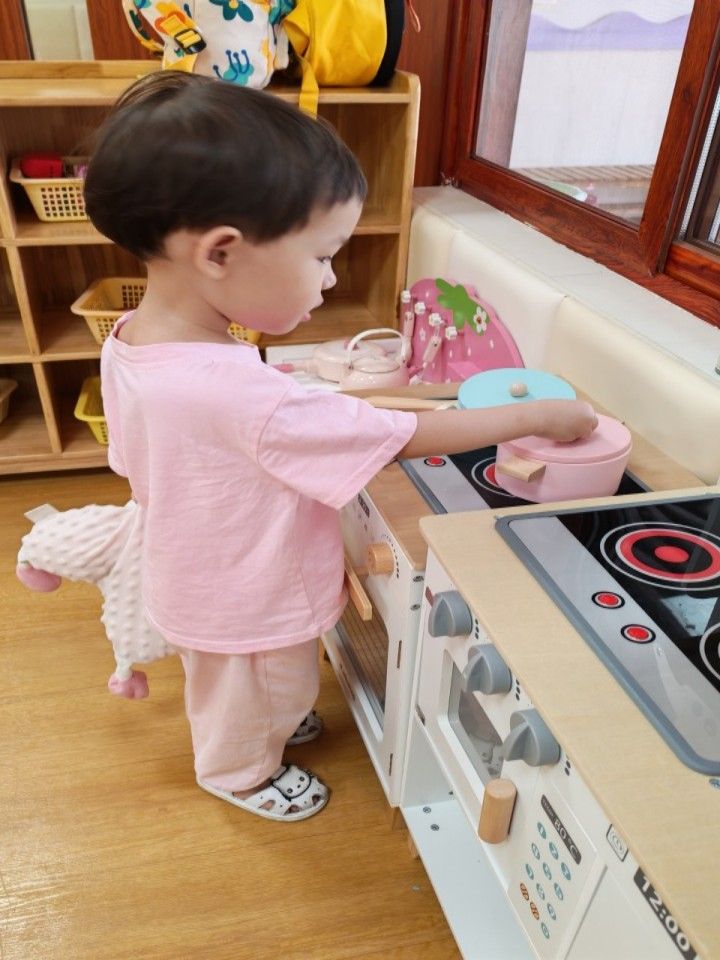 操作区里,宝贝们用自己能干的小手拼出各种造型,举着小车喊“小车开过去啦”;“今天我搭了大房子”“我拼了玩具手枪”;娃娃家中宝贝们正煮美味可口的饭菜;阅读区里,几个小脑袋凑在一起,跟着老师的声音数绘本里的小兔子,偶尔冒出一句“我家也有”的童言童语。