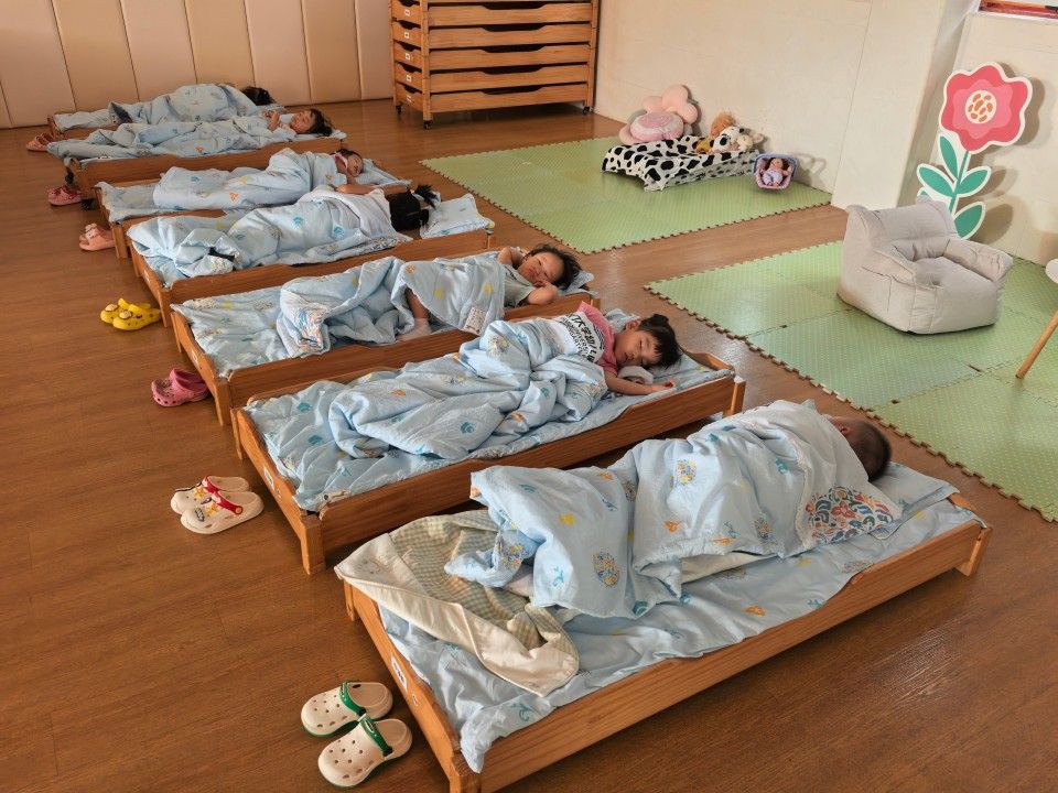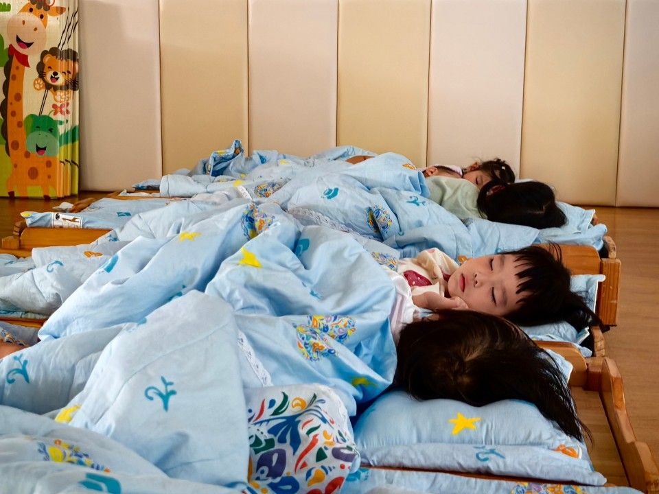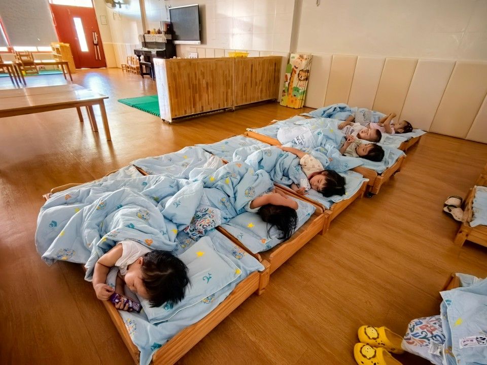 玩累了的宝贝们,回到教室后开始准备午睡,盖好小被子,听着轻柔的儿歌,不一会儿,教室里就安静下来。有的宝贝抱着自己带来的小玩偶,嘴角还带着浅浅的笑意;有的则侧着小脑袋,小脸蛋埋在柔软的枕头上,睡得格外香甜。