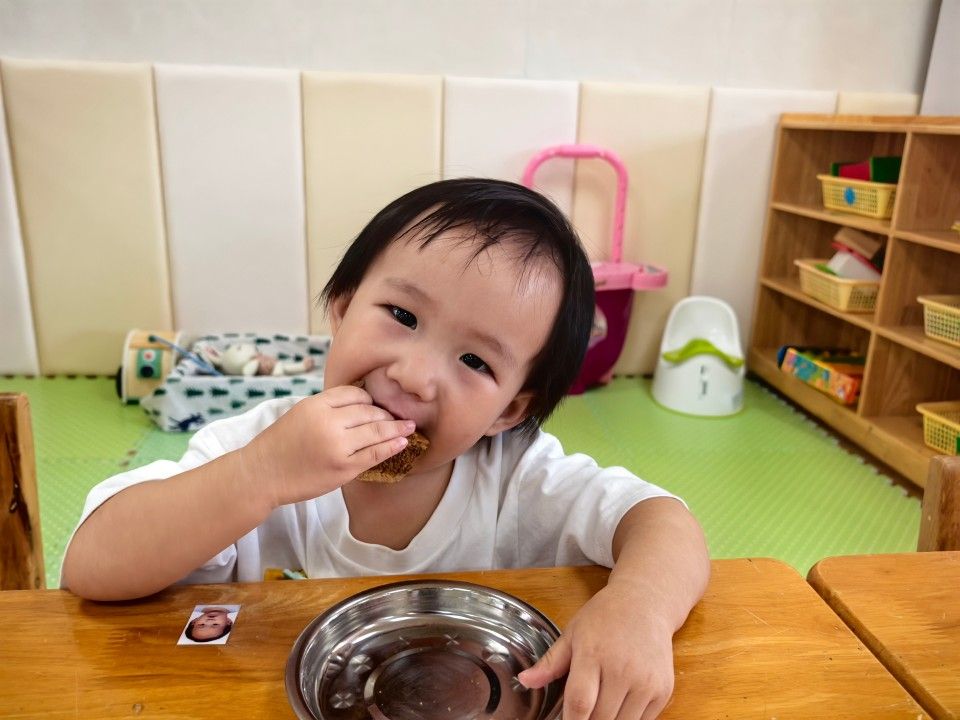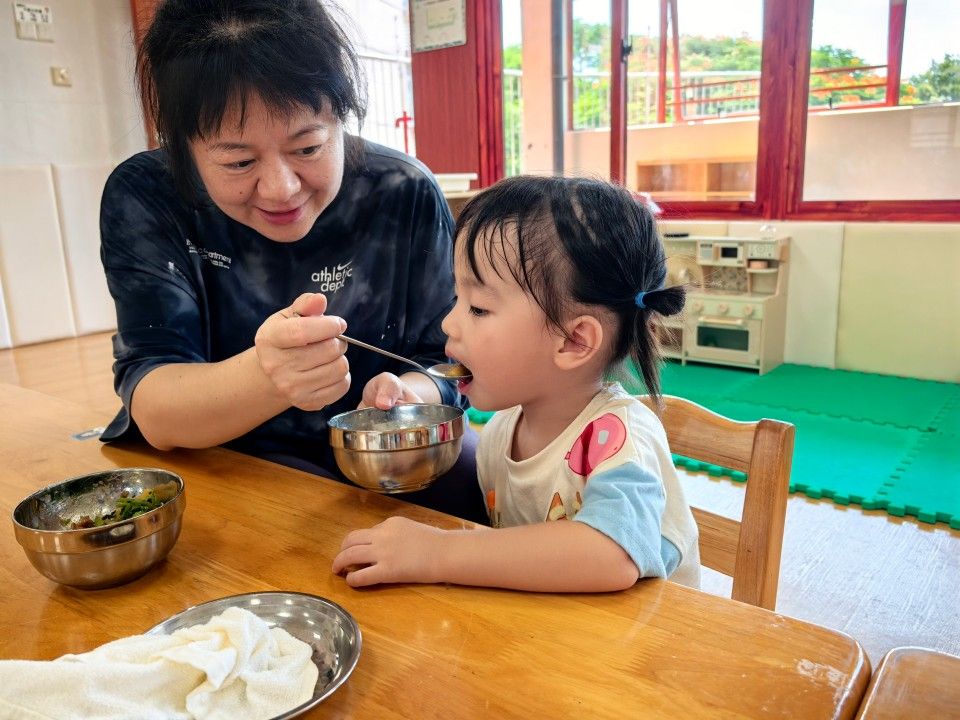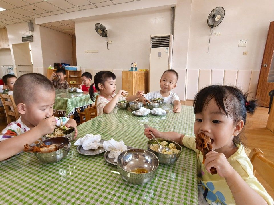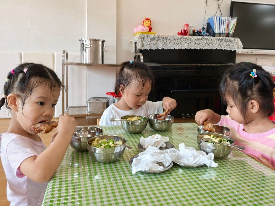 午餐时间到啦!宝贝们握着小勺子,努力把香香的食物送进嘴里。有的宝贝刚开始握勺还不太熟练,饭粒偶尔掉在桌上,却依旧坚持自己吃;遇到不爱吃的青菜,老师便耐心引导。每一个认真吃饭的小模样,都藏着悄悄长大的小进步。