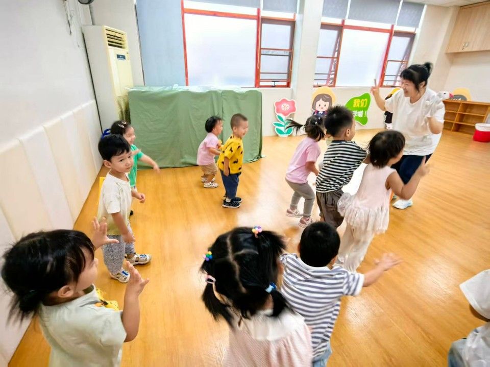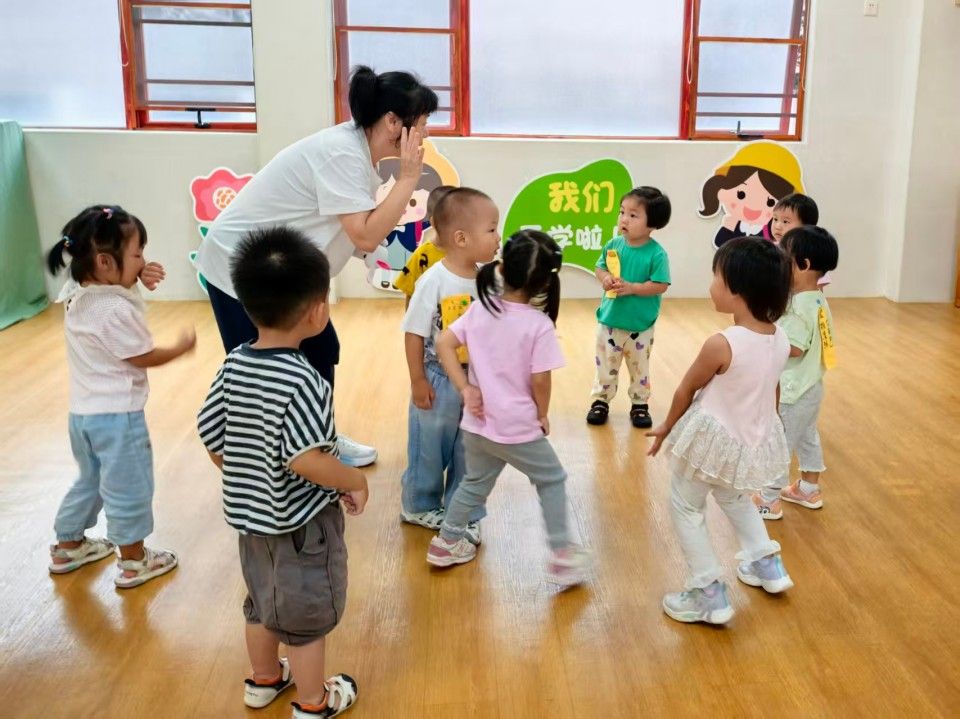 看!老师正带着宝贝们玩游戏、学本领。小家伙们跟着老师的节奏晃着小身子、迈着小步子,时不时发出奶声奶气的笑声,整个小教室都被这欢快的氛围填满啦。