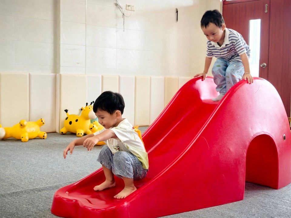 午后的阳光变得格外温柔,老师带着宝贝们来到户外活动场地。踏出教室,走进草坪和感统游戏室后,宝贝们就像撒欢的小鸽子般活跃起来:有的奔向毛毛虫隧道,趴在上面玩得不亦乐乎;有的追着草地上滚动的小皮球跑,清脆的笑声像银铃般回荡在草地上。宝贝们的小小身影穿梭着,把开学初的小紧张,全都藏进了这满是阳光与欢乐的户外时光里。