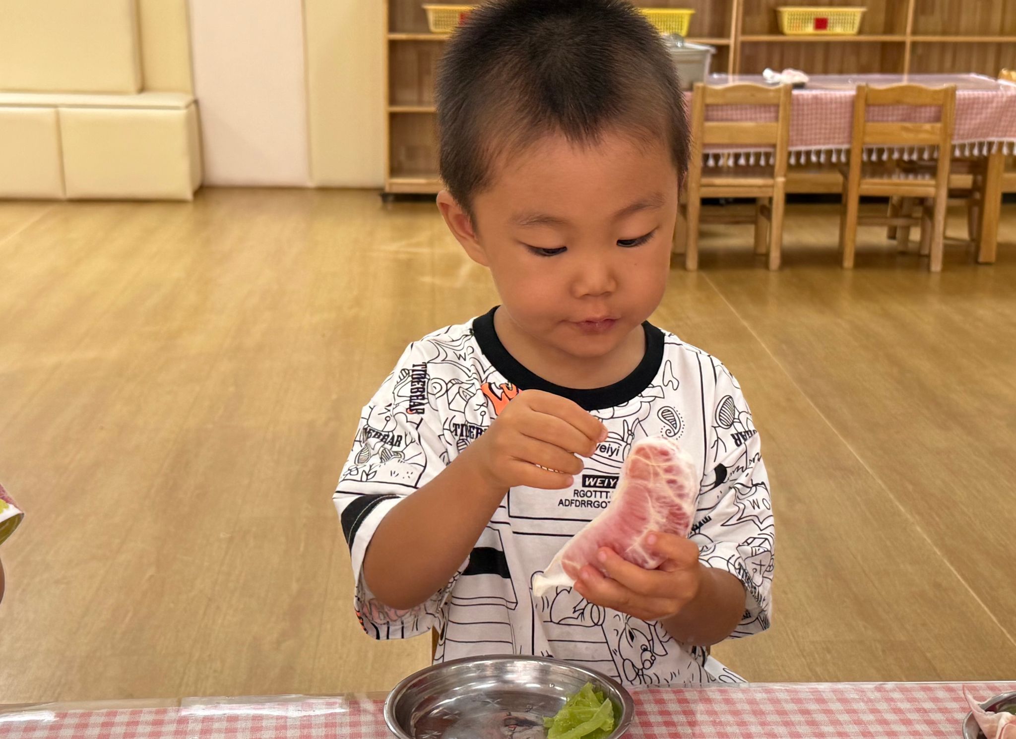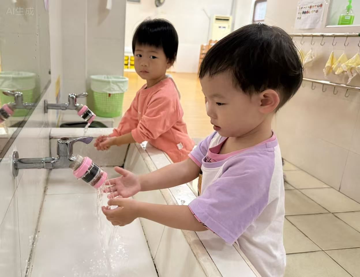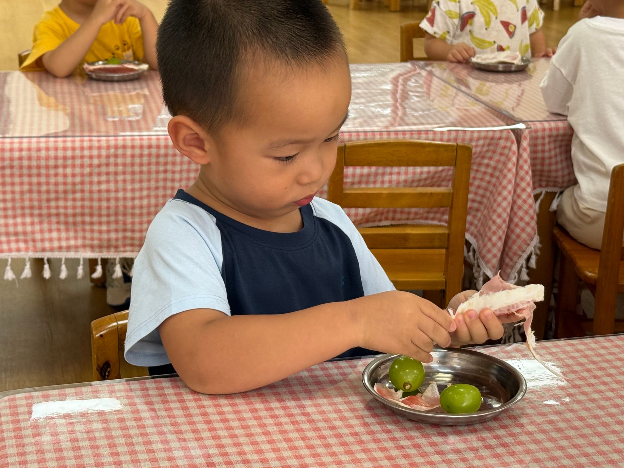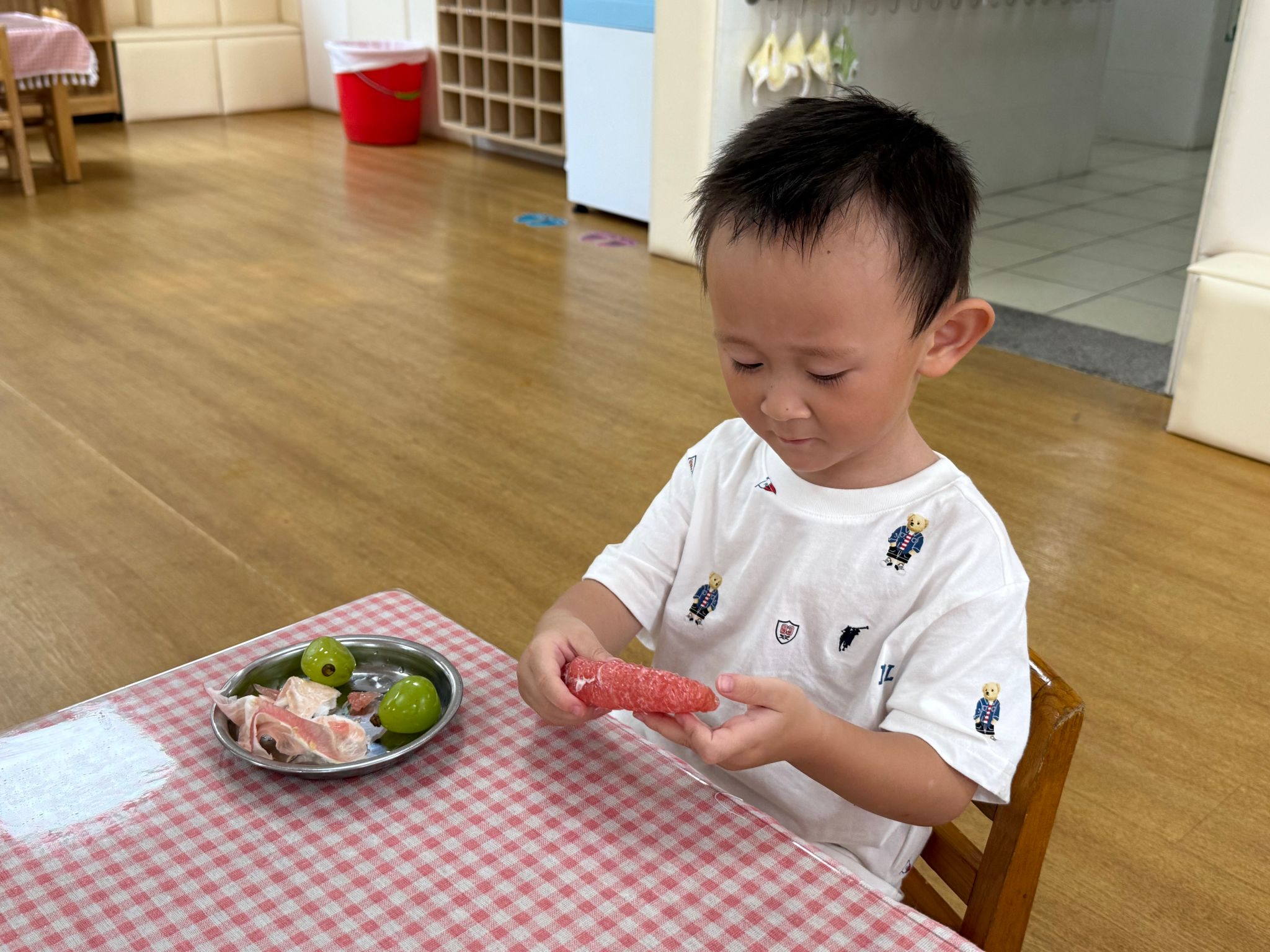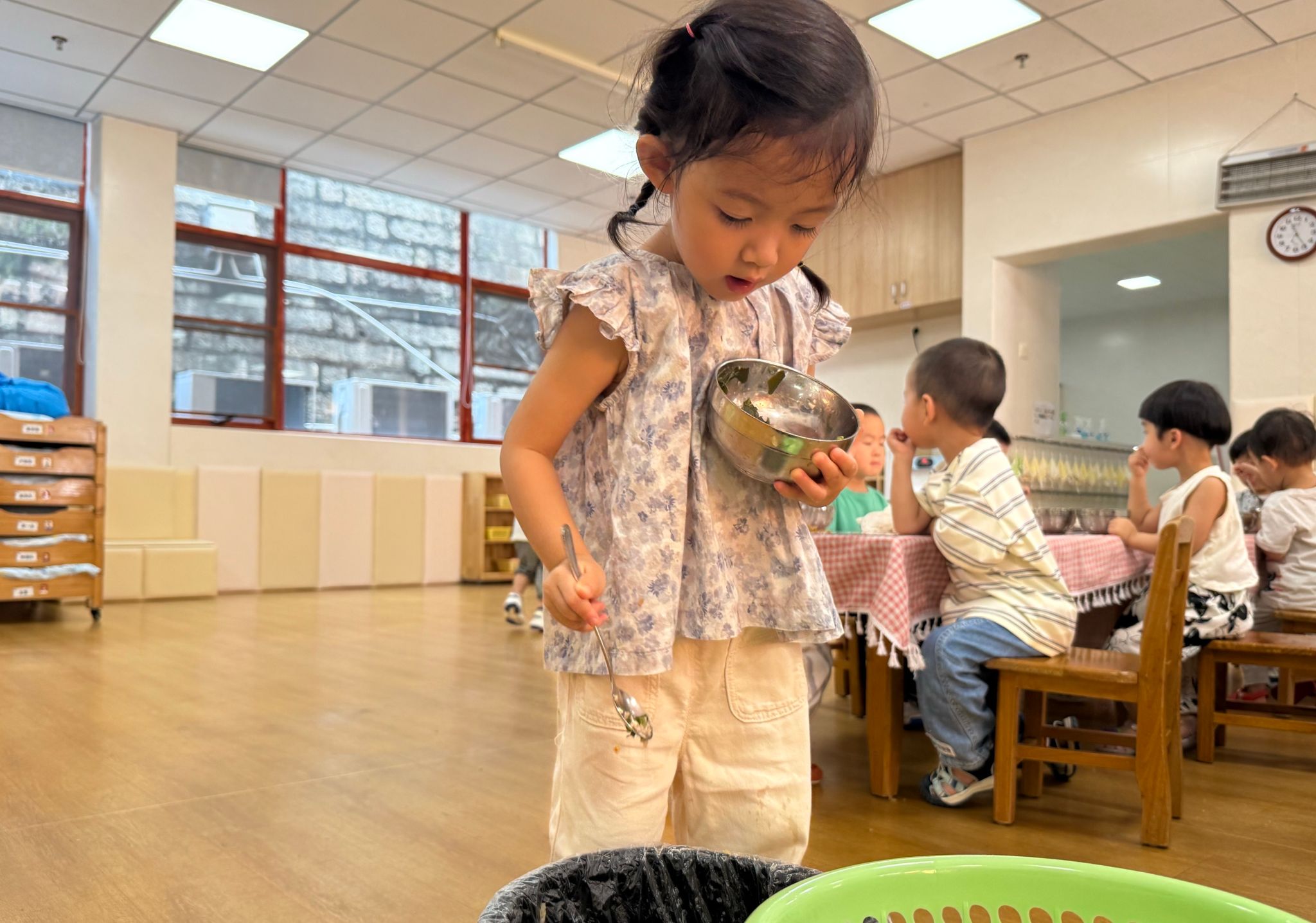 “我的小手真有用!”——早餐后的整理变得更有挑战性。瞧,他们排着队伍,尝试着自己夹起早餐,成就感满满;学习叠放小碗,叮叮当当的声音是劳动的交响乐;漱口时,会拿着杯子,鼓起小嘴弯下腰,下午吃水果时也开始动起小手自己剥水果皮啦!户外游戏后大家都争先恐后想要收玩具。个人卫生习惯在趣味中悄然养成。